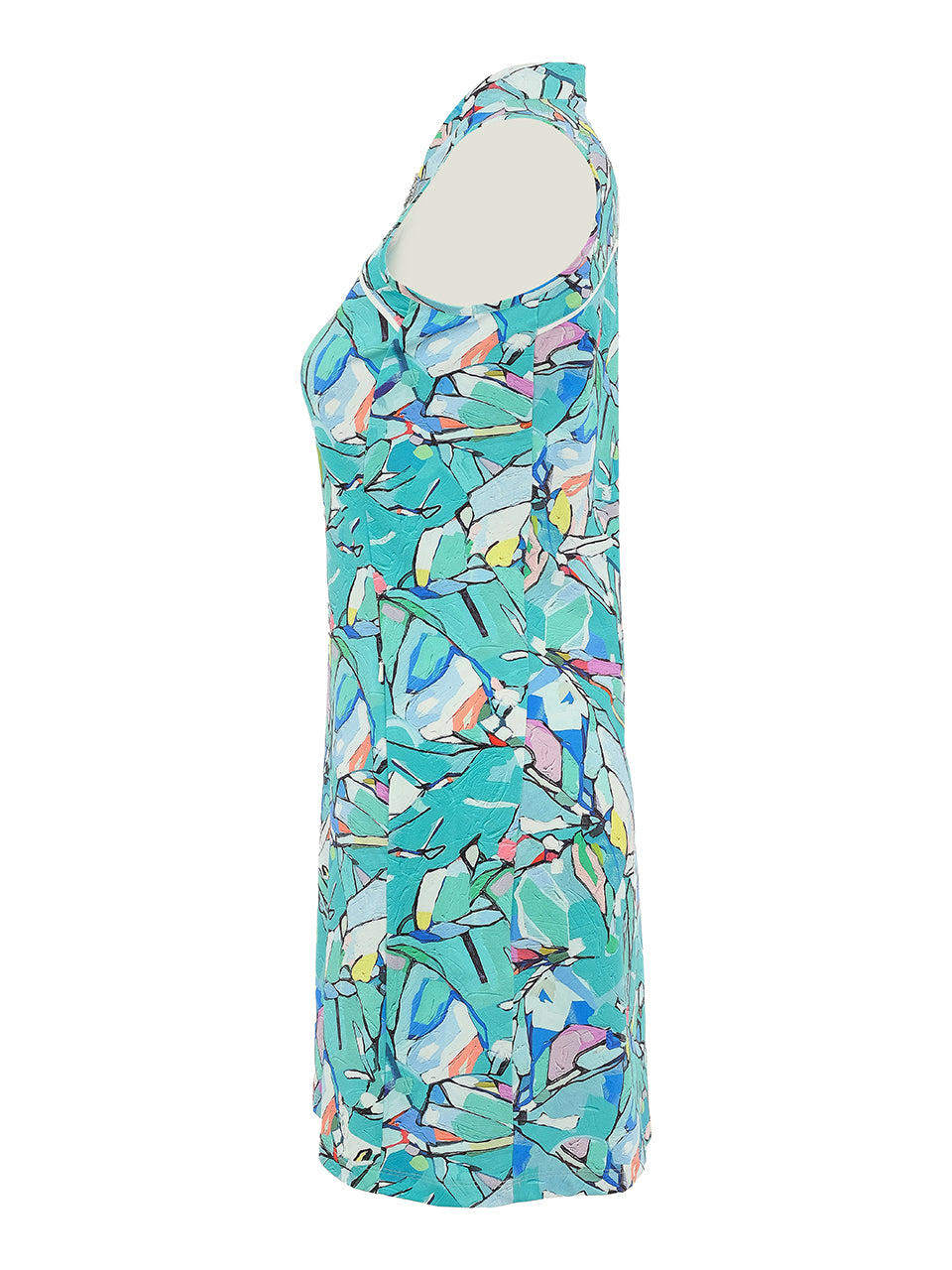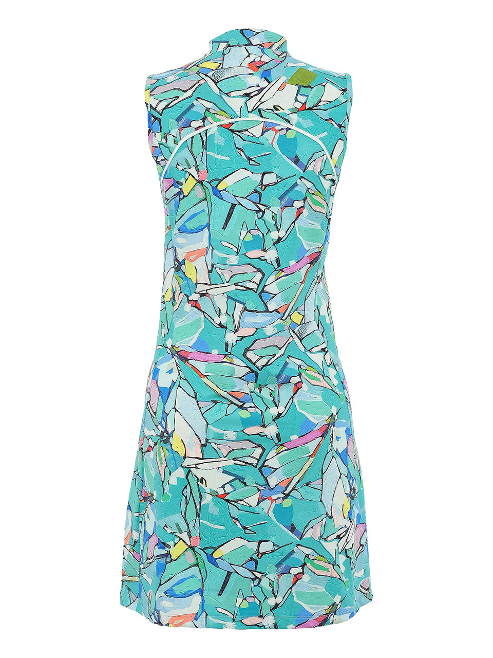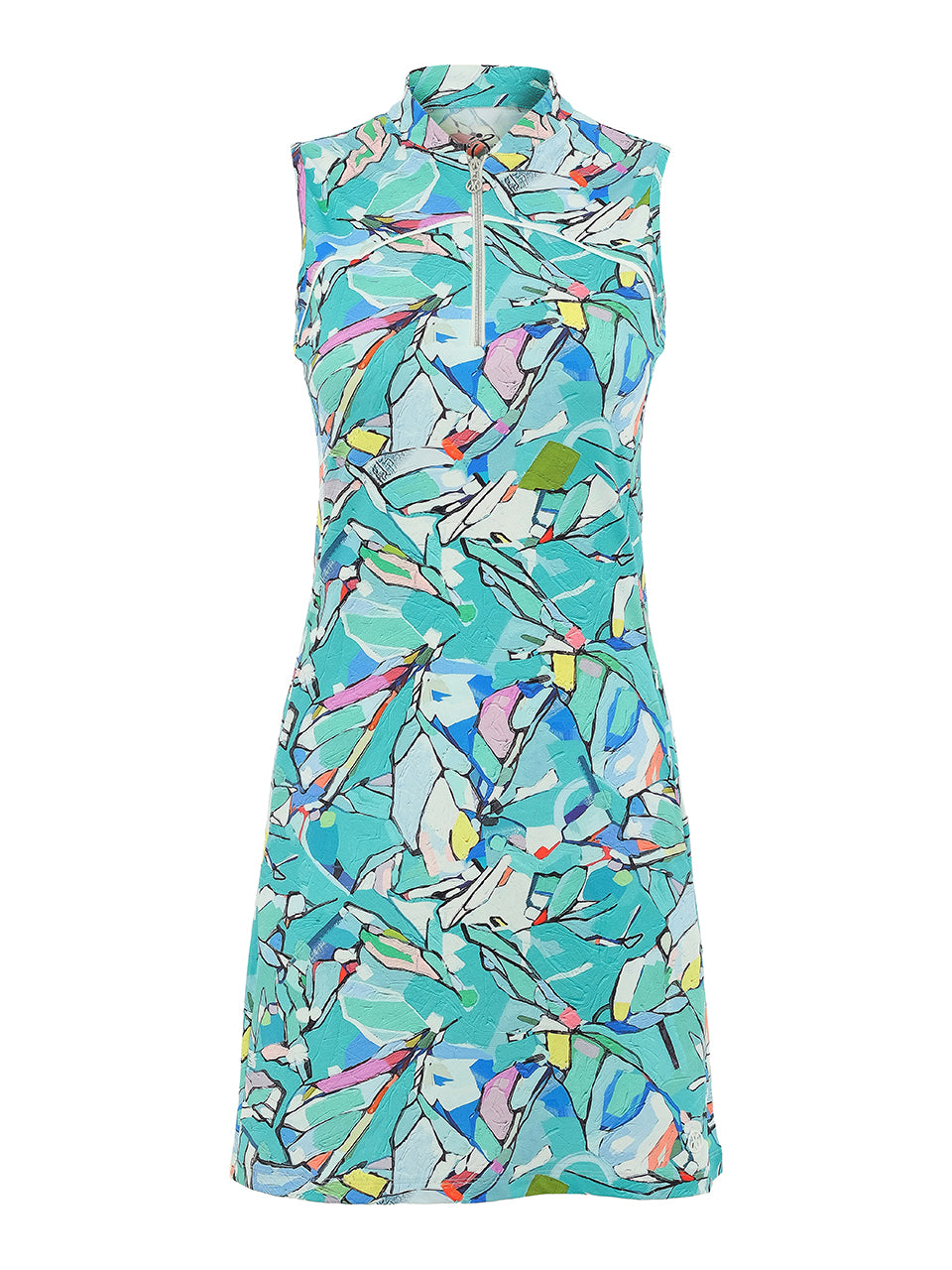 A vibrant sleeveless golf dress featuring a striking abstract mosaic print in refreshing shades of turquoise, aqua, blue, and soft accents of coral and yellow. Designed with a sleek stand collar and sporty half-zip neckline, it offers a flattering silhouette and comfortable stretch for easy movement on the course. Stylish and energetic, this dress blends athletic performance with bold artistic flair for sunny days on the green. ⛳️