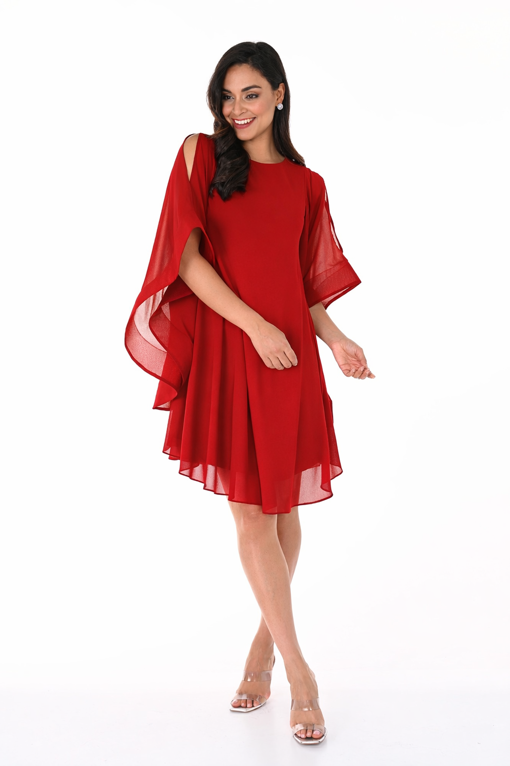 This chiffon dress combines understated luxury with wearable comfort. Cape-inspired sleeves and a fluid A-line cut create an instantly polished look, while the airy layered fabric moves gracefully with you. Whether you're attending a wedding or evening event, this piece delivers timeless sophistication without sacrificing ease.
