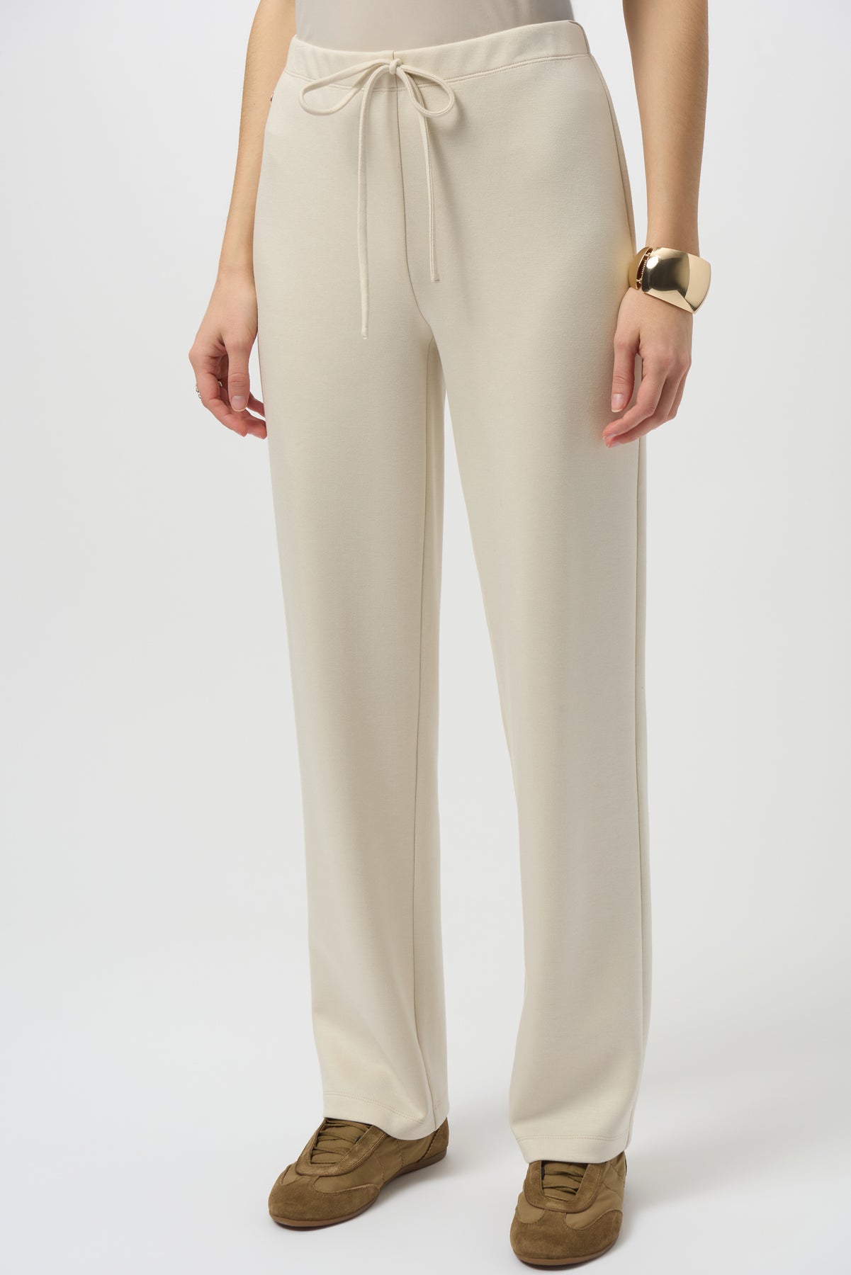 Enjoy ultimate comfort in these straight leg pull-on pants made from soft, flexible scuba jersey knit. The concealed elastic waistband offers a sleek, refined fit, complemented by a fashionable faux drawstring detail.