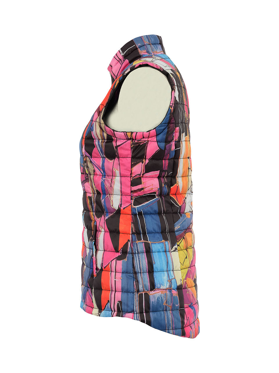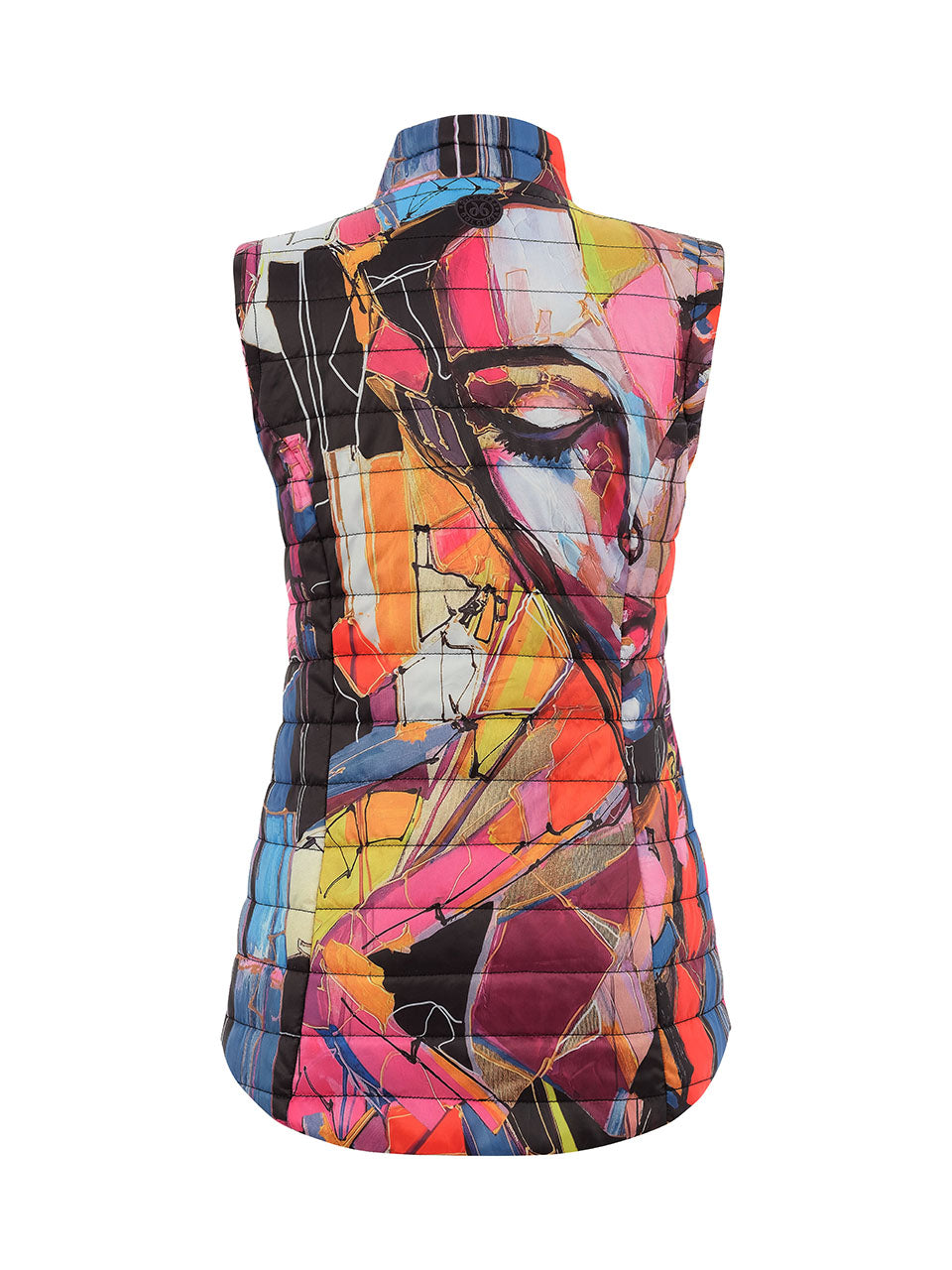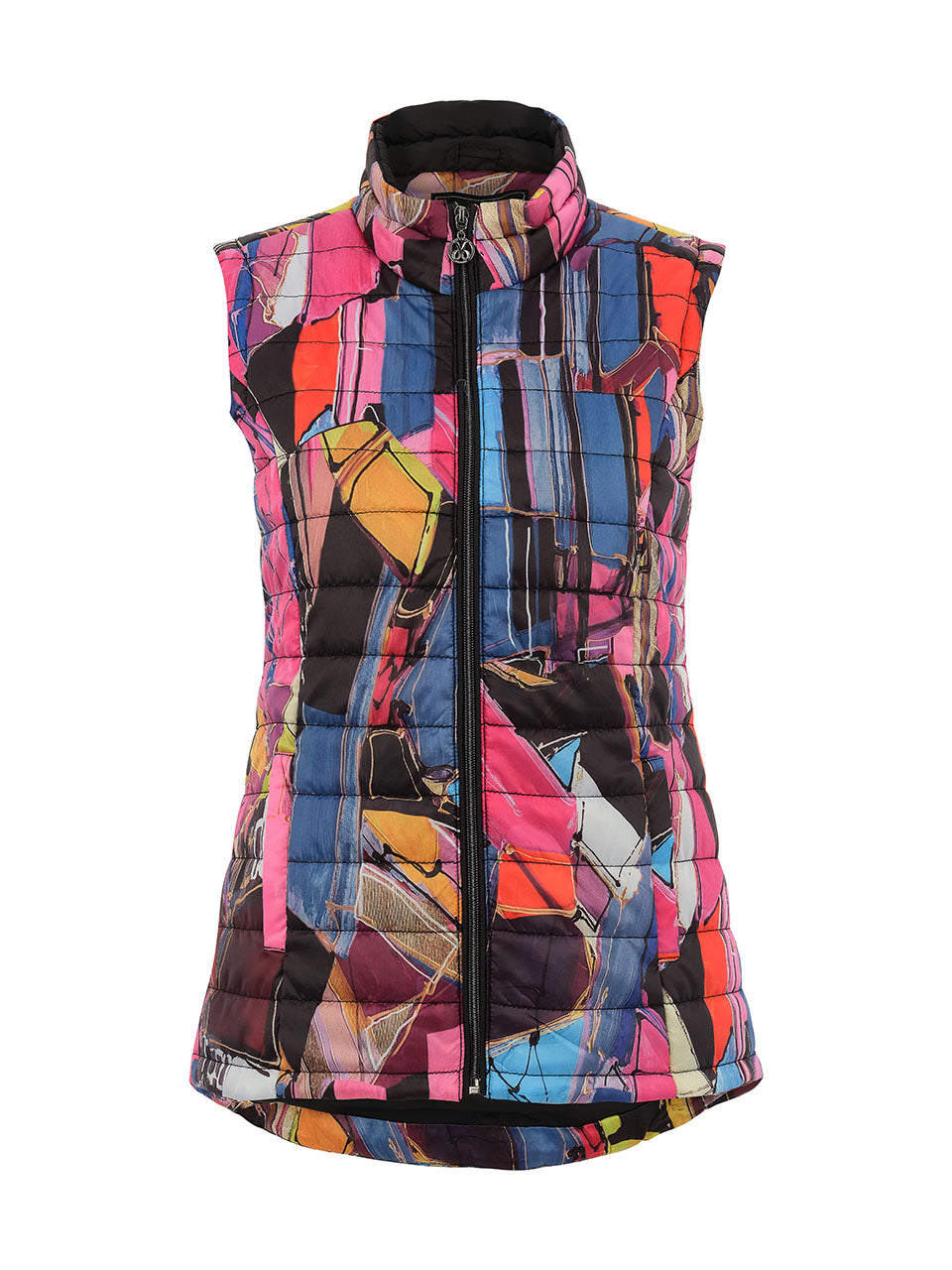 A sleek quilted vest featuring a vibrant abstract print inspired by colorful brushstrokes and geometric shapes. Designed with a lightweight padded construction, it offers warmth without bulk while maintaining a flattering, streamlined fit. The high stand collar and full-zip front provide extra protection and versatility, making it perfect for layering over activewear or casual outfits on cooler days. Stylish, sporty, and eye-catching, this vest brings energy and color to any look.
