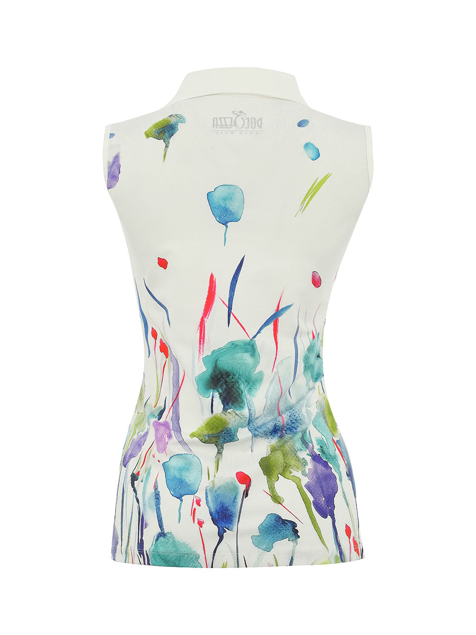 A graceful sleeveless polo that blends sporty elegance with artistic charm. Featuring a soft watercolor floral print inspired by a blooming meadow, this lightweight top brings color and movement to your look. The crisp collar and button placket add a polished touch, while the stretch fabric offers breathable comfort and freedom of movement—perfect for warm days on the course or effortless resort style.