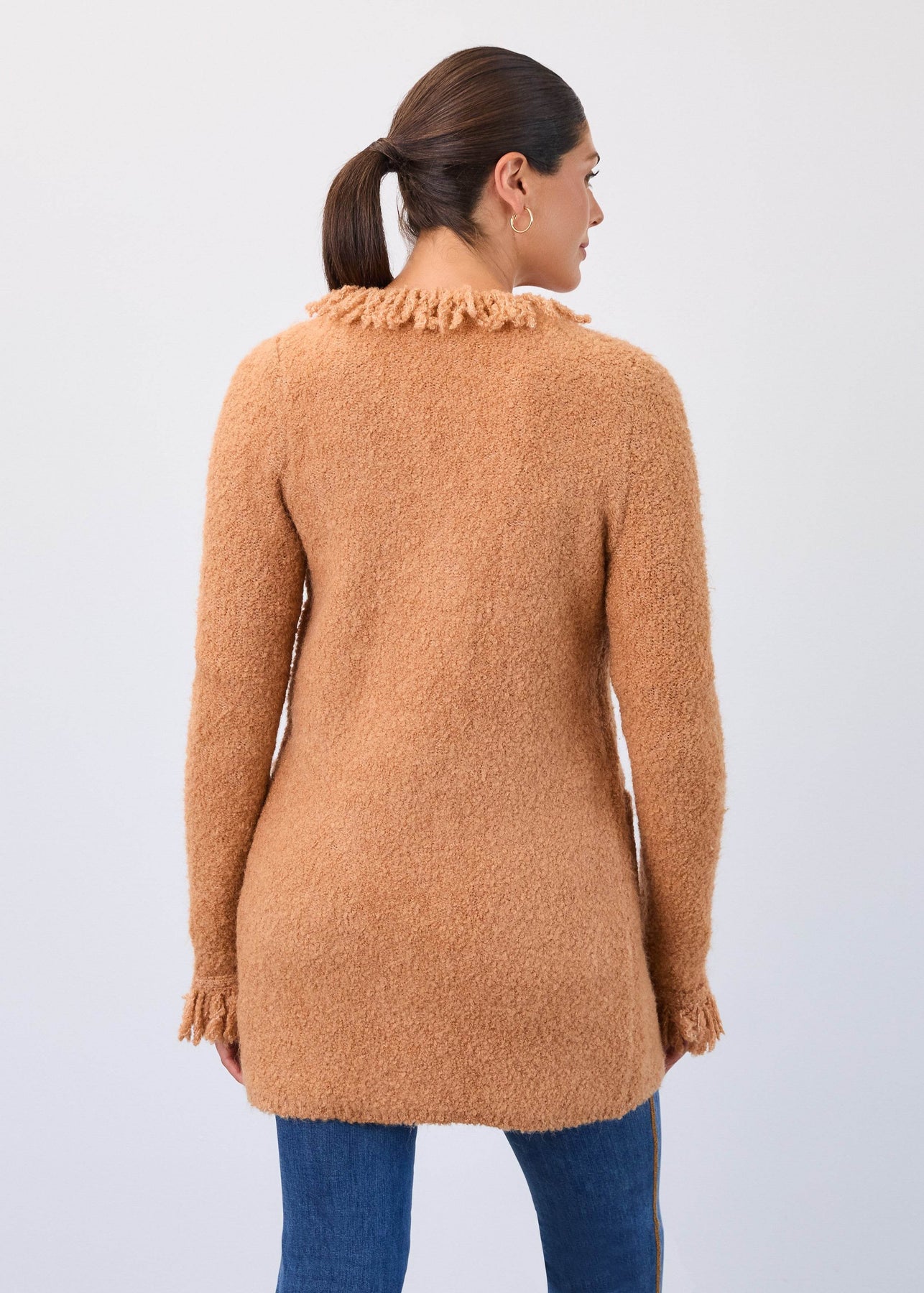 Elevate your wardrobe with the Fringed Cardigan Coat, featuring stylish self-yarn fringe that adds texture and movement to your look. This versatile piece combines the cozy comfort of a cardigan with the warmth of a coat, making it perfect for layering during cooler days. Its unique fringe detailing sets you apart with a subtle yet eye-catching flair, ideal for both casual outings and more polished occasions. Embrace effortless style and comfort with this standout addition to your collection.