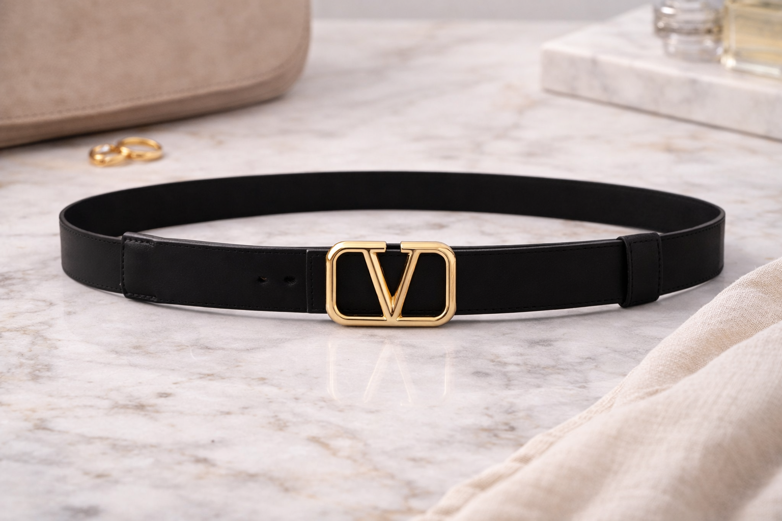 A sleek, minimalist belt designed with a smooth finish and a refined gold-tone “V” buckle for a modern statement. The slim silhouette offers versatile styling, perfect for defining the waist or elevating everyday looks. Effortlessly polished, this piece adds a touch of understated luxury to any outfit.