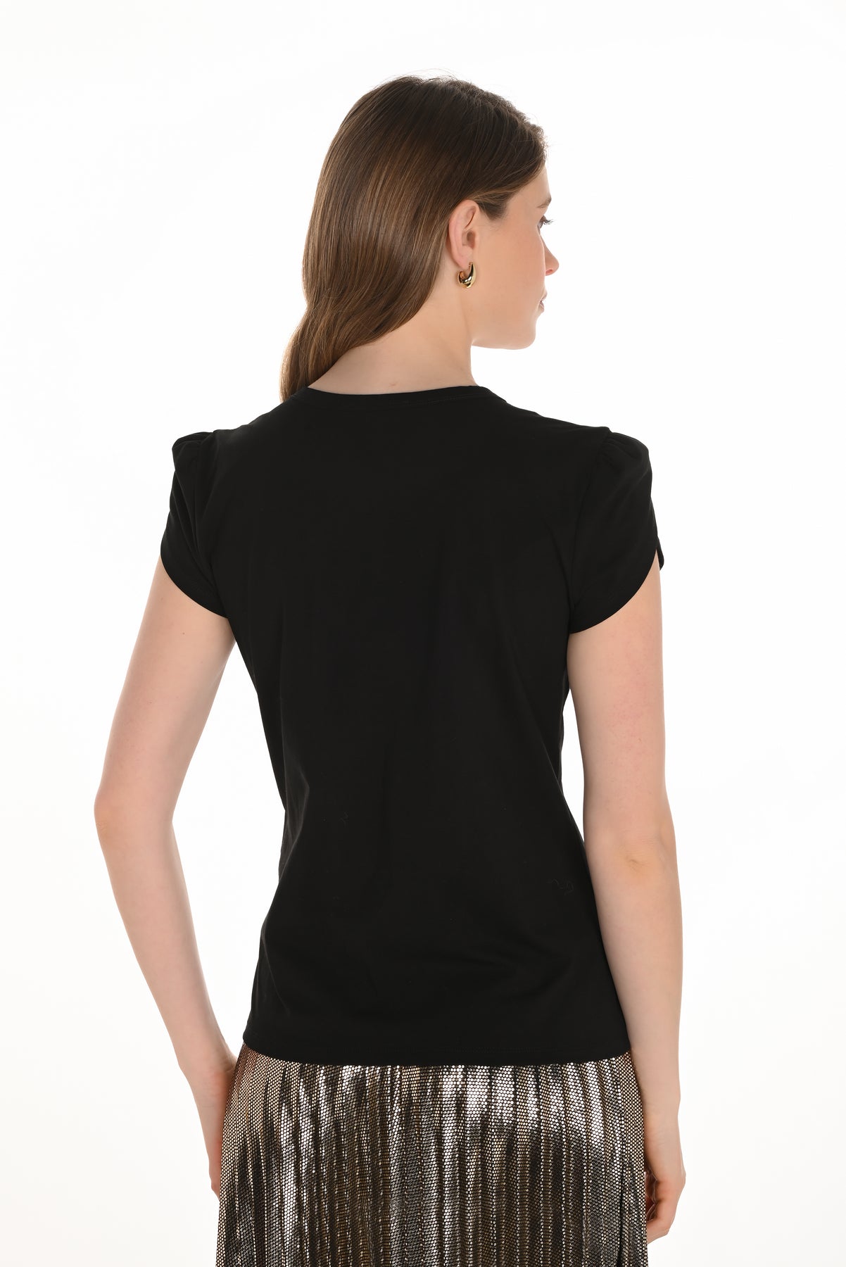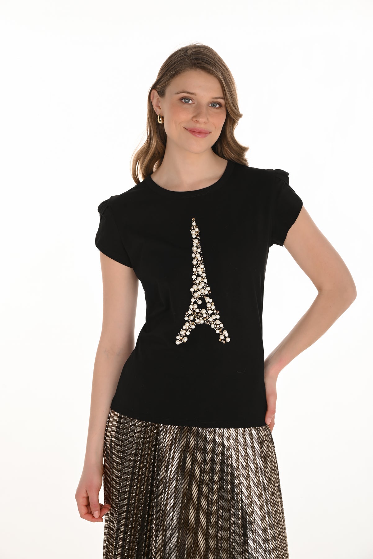 Bring a touch of Parisian charm to your everyday style. This standout tee features a beautifully embellished Eiffel Tower motif, crafted from luminous pearls and sparkling accents that catch the light with every move. Soft, comfortable, and effortlessly chic, it blends casual ease with a refined, fashion-forward feel.