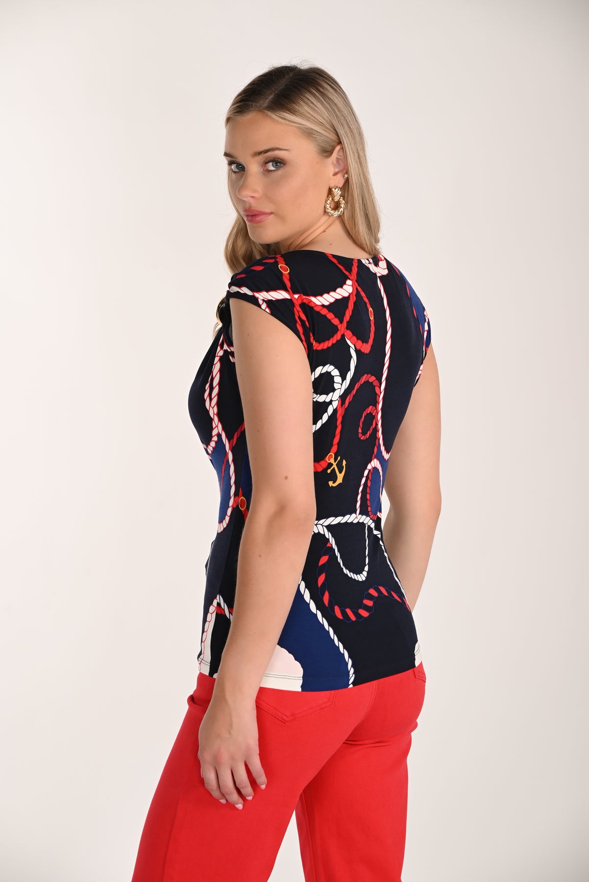 Nautical-inspired top with rope and anchor print in navy, red, and white. Features an asymmetric neckline with gold-tone shoulder accent and soft, stretch fabric for comfortable all-day wear. Perfect paired with white or red pants for a polished maritime style.