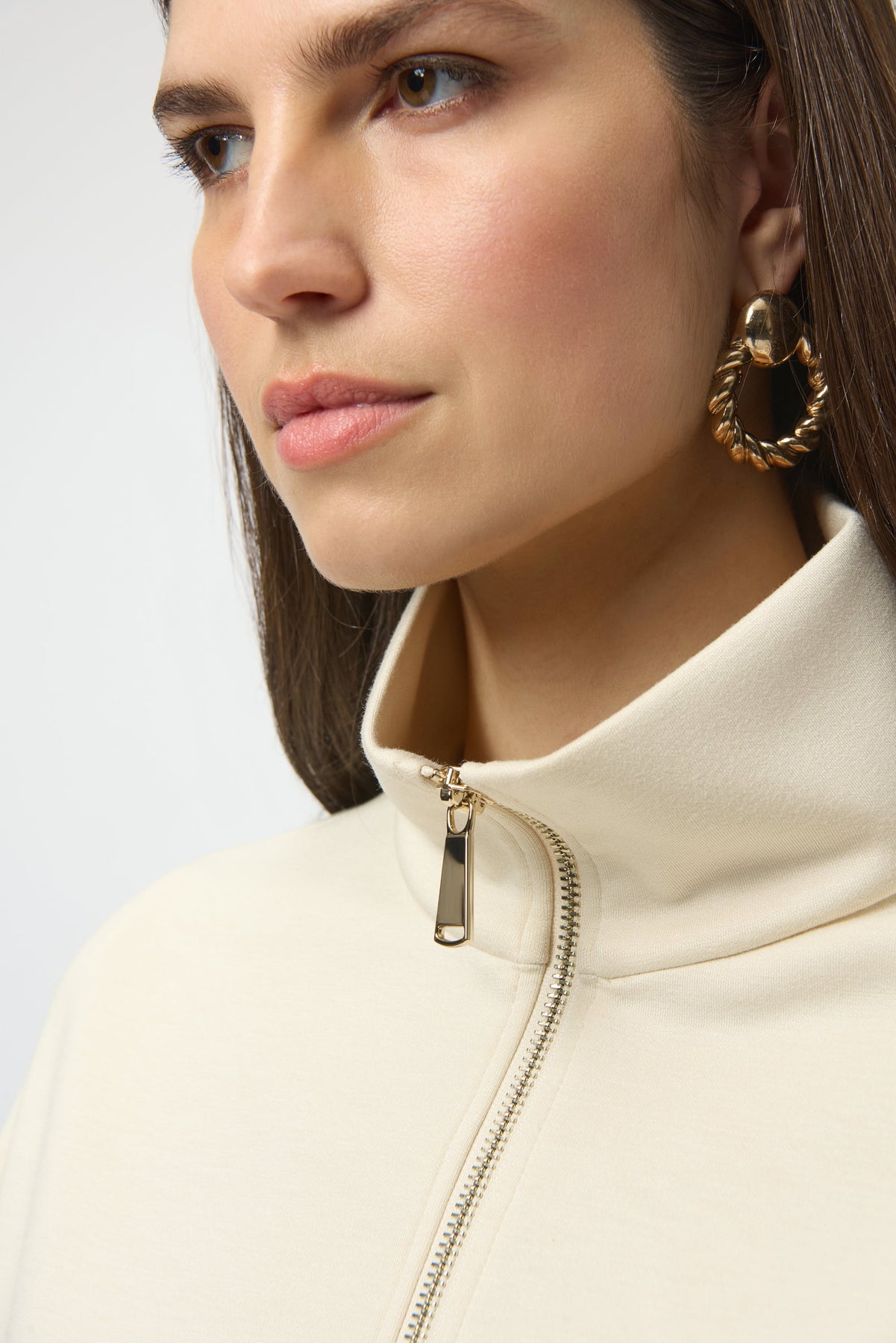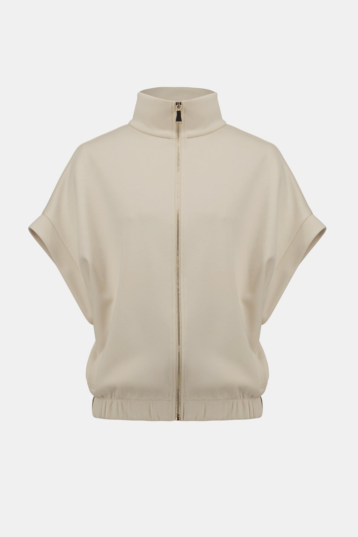 A modern boxy jacket with scuba jersey construction, stand collar, front zipper, and welt pockets. The distinctive JR coin ornament adds a refined finishing touch.