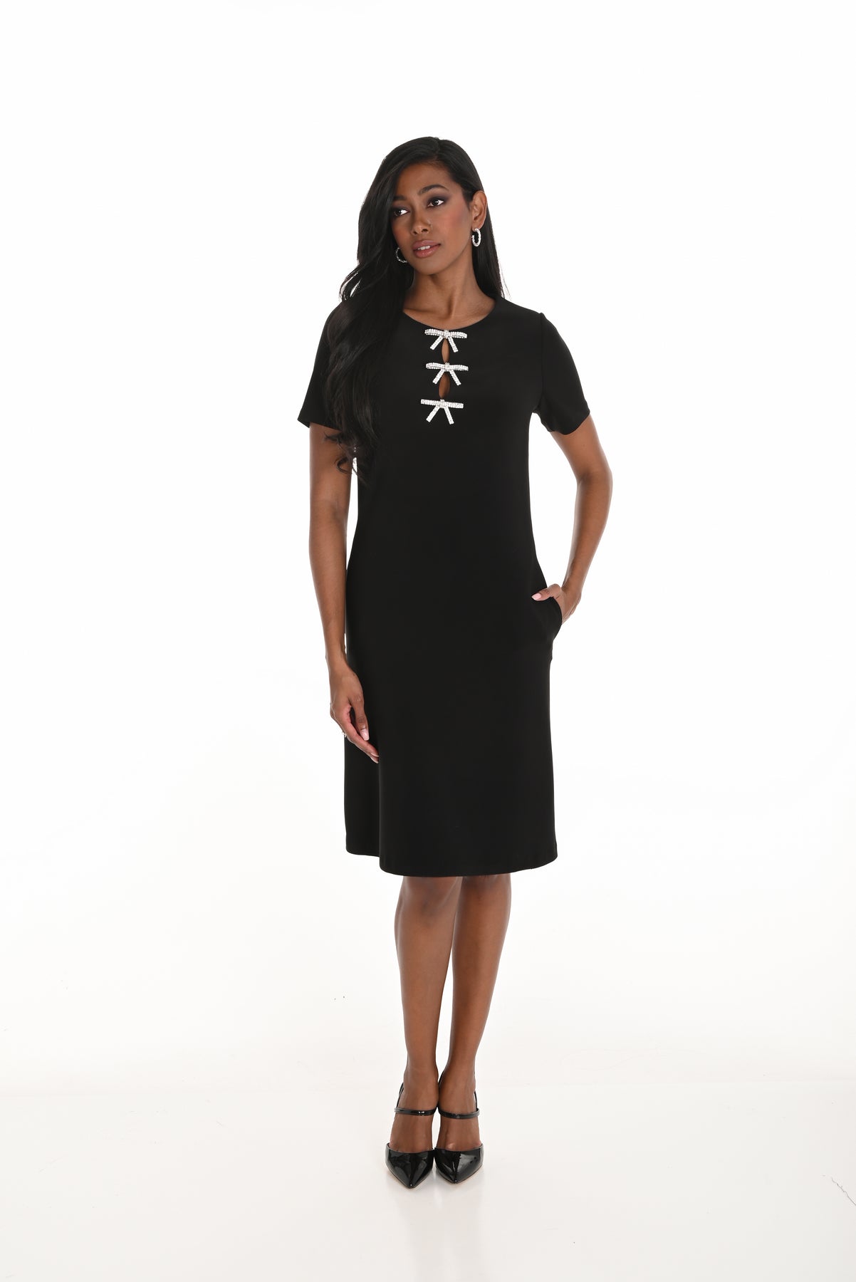 Elegant and understated, this short sleeve shift dress is designed with a clean silhouette and standout bow trim at the neckline for a polished feminine touch. The flattering straight fit skims the body with ease, making it a chic choice for dinners, events, or elevated daywear. Timeless and versatile, it’s the kind of piece that dresses up effortlessly.