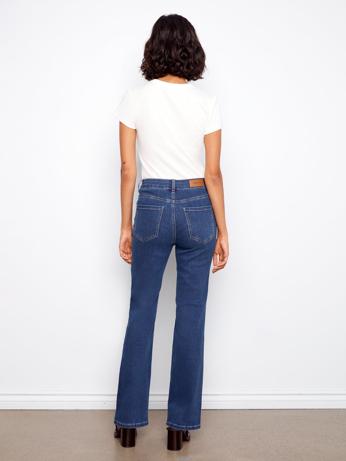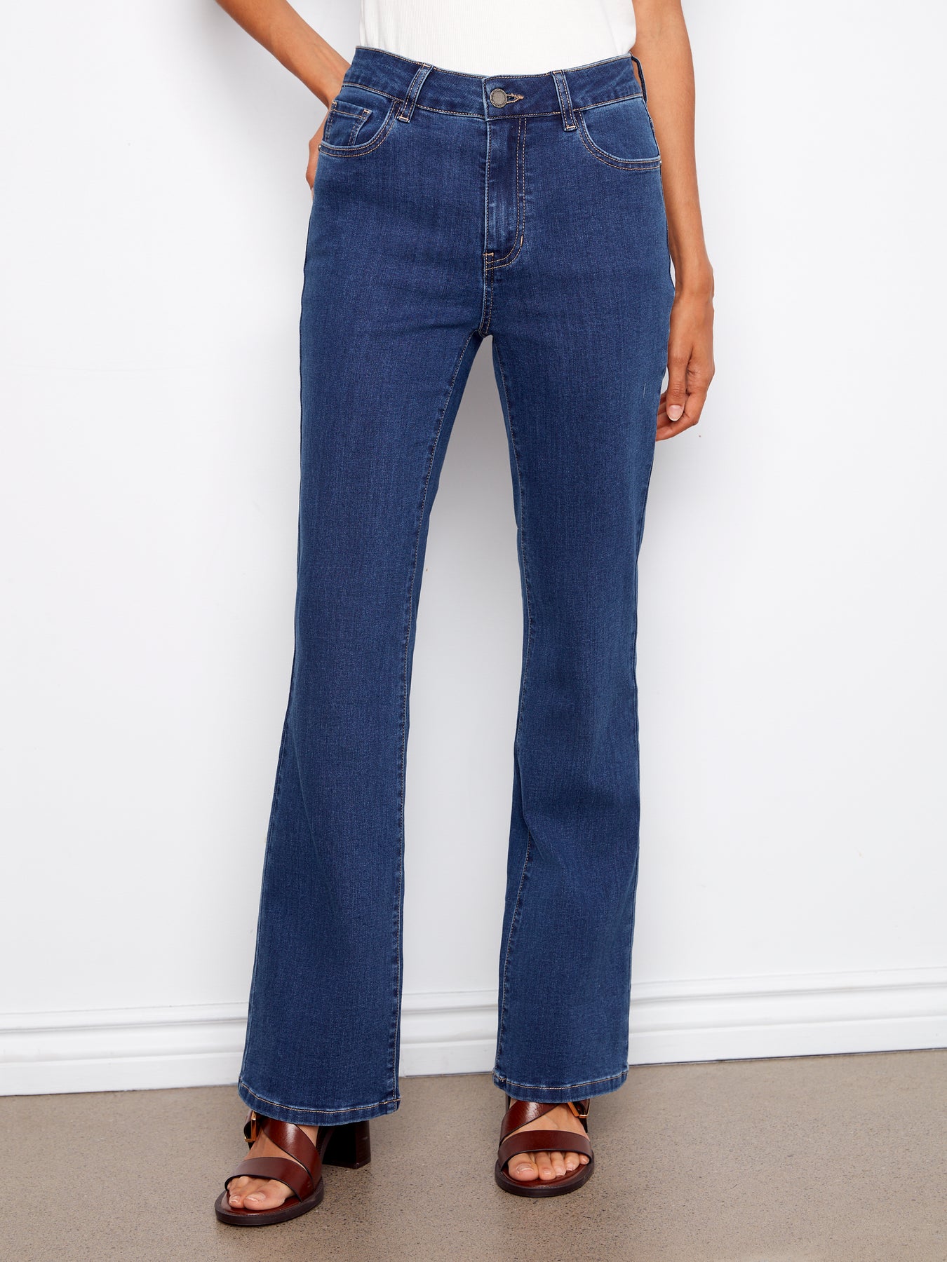 The Celine Flare Leg Jeans blend vintage-inspired style with a modern, flattering fit. Designed to sit smoothly through the waist and hips, they gradually open into a soft flare leg that creates a long, balanced silhouette. Finished with classic five-pocket styling and soft stretch denim, they offer the perfect mix of everyday comfort and effortless polish.