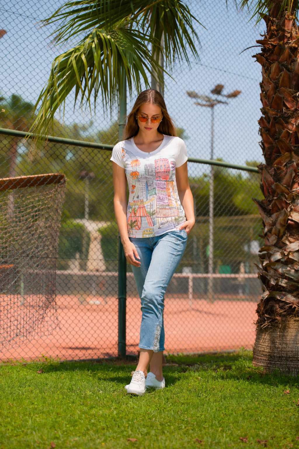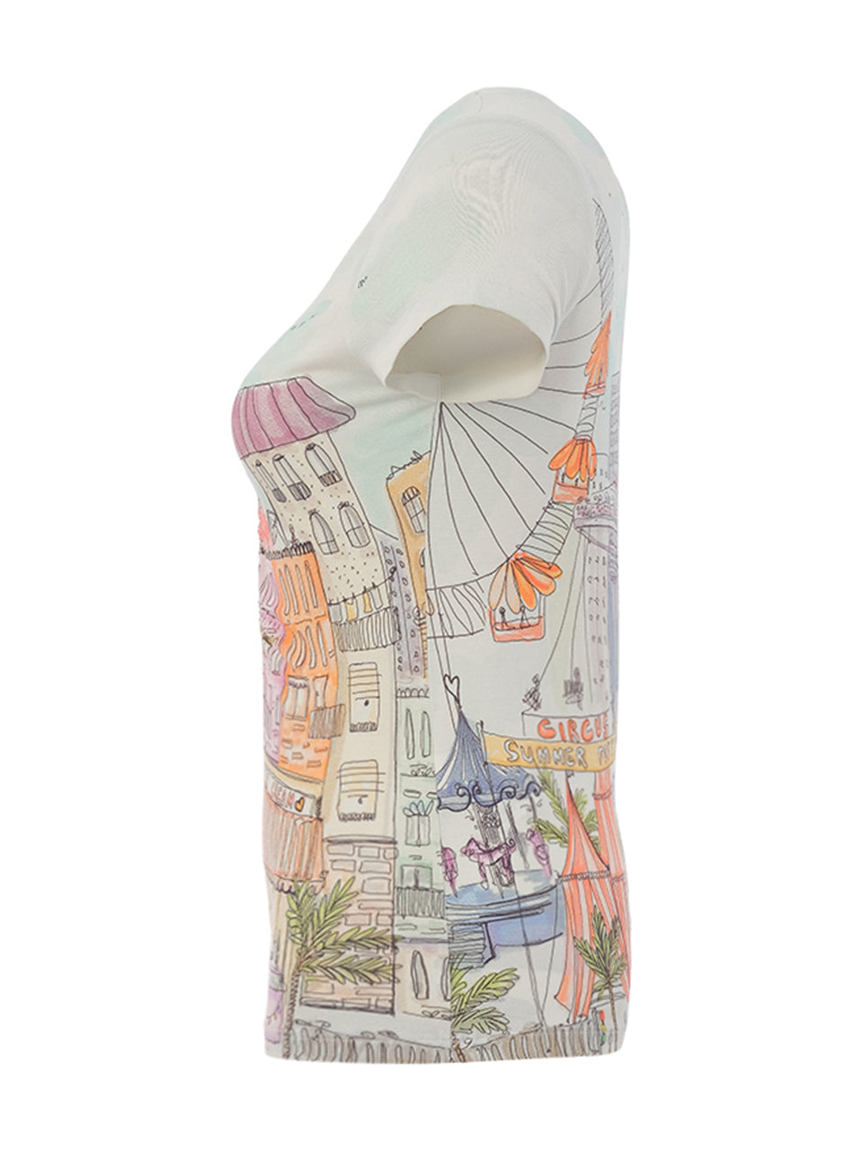 A playful expression of art and color, this fitted tee brings the charm of a hand-drawn cityscape to life. Designed with soft stretch fabric for a flattering silhouette, it features an artistic sketch print accented with vibrant citrus-inspired tones. The classic scoop neckline and short sleeves make it an easy everyday piece, while the detailed illustration adds a unique, gallery-worthy feel. Perfect for pairing with denim or crisp white bottoms for a fresh, creative look.