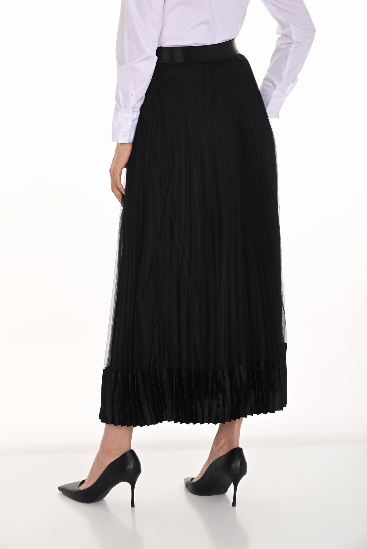 This beautifully crafted pleated midi skirt flows with effortless grace, creating movement that feels both romantic and refined. The sheer overlay and softly structured pleats add depth and dimension, while the sleek waistband ensures a flattering, comfortable fit. Pair it with the pearled Eiffel tee for a chic, Paris-inspired ensemble — polished enough for evenings out, yet easy enough for everyday sophistication. A timeless piece that instantly makes you feel dressed with intention.