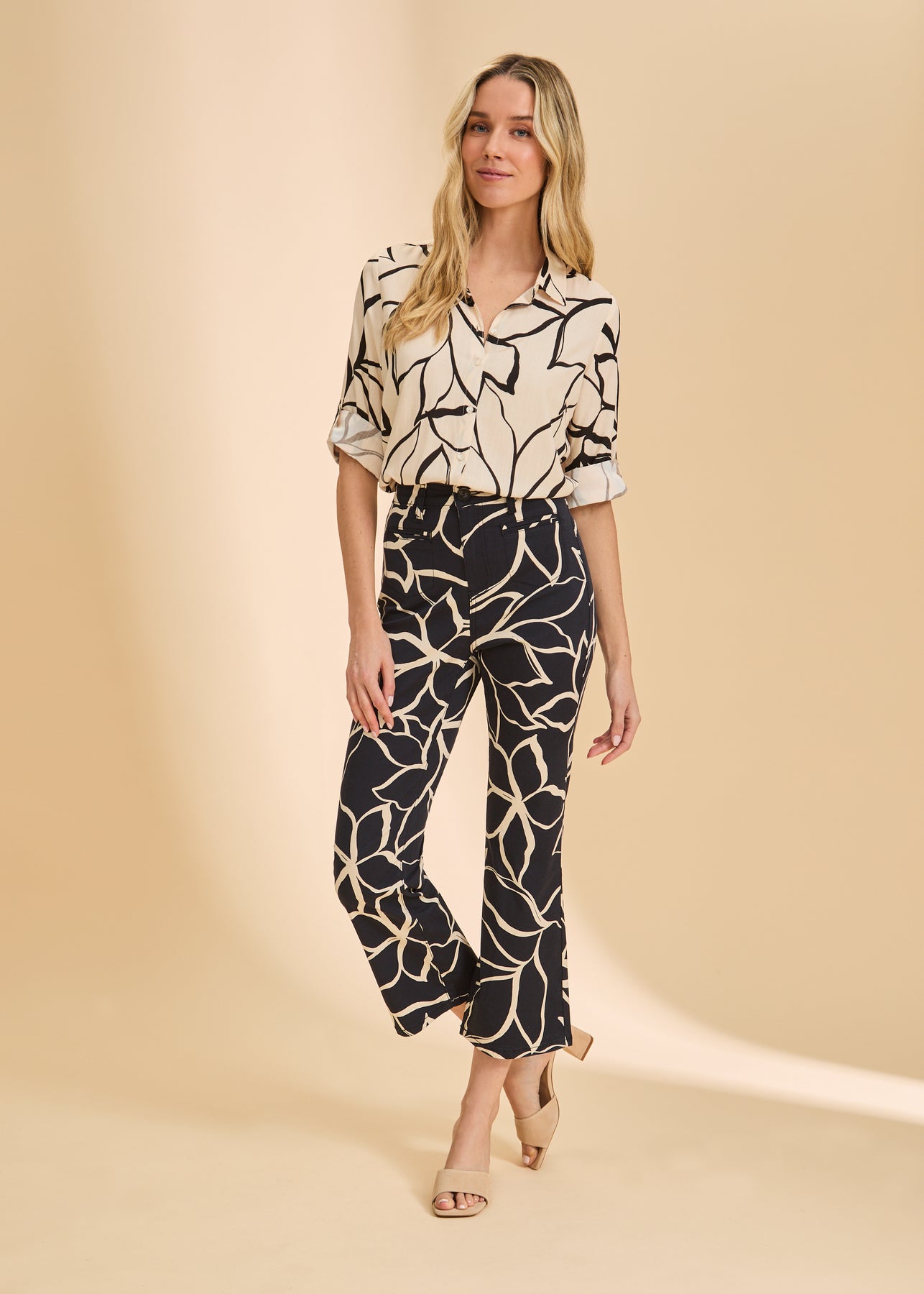 Wide-leg crop pants with a bold floral print that commands attention. Mid-rise fit with classic five-pocket design offers comfort and style. Soft woven fabric drapes elegantly while keeping its shape for a polished, versatile look that works from day to night.