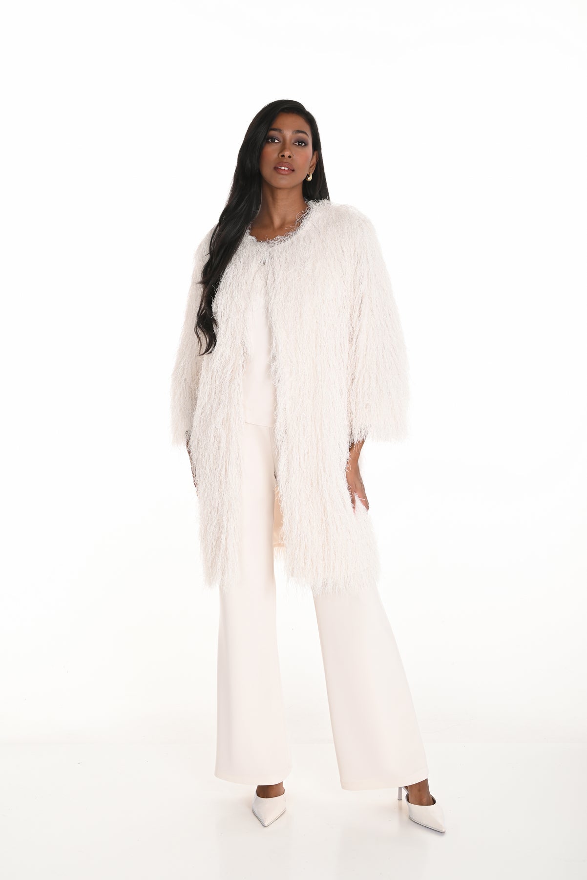 Sublimez votre allure avec l'exquis manteau long texturé Feathered Elegance, d'une teinte ivoire envoûtante. Sa riche texture à plumes apporte profondeur et sophistication à votre garde-robe. Sa coupe ouverte sur le devant et mi-cuisse allonge la silhouette avec élégance, rehaussée par des manches 3/4 chics pour une touche contemporaine. Idéal à superposer à une tenue noire élégante en soirée ou à affirmer votre style en journée.