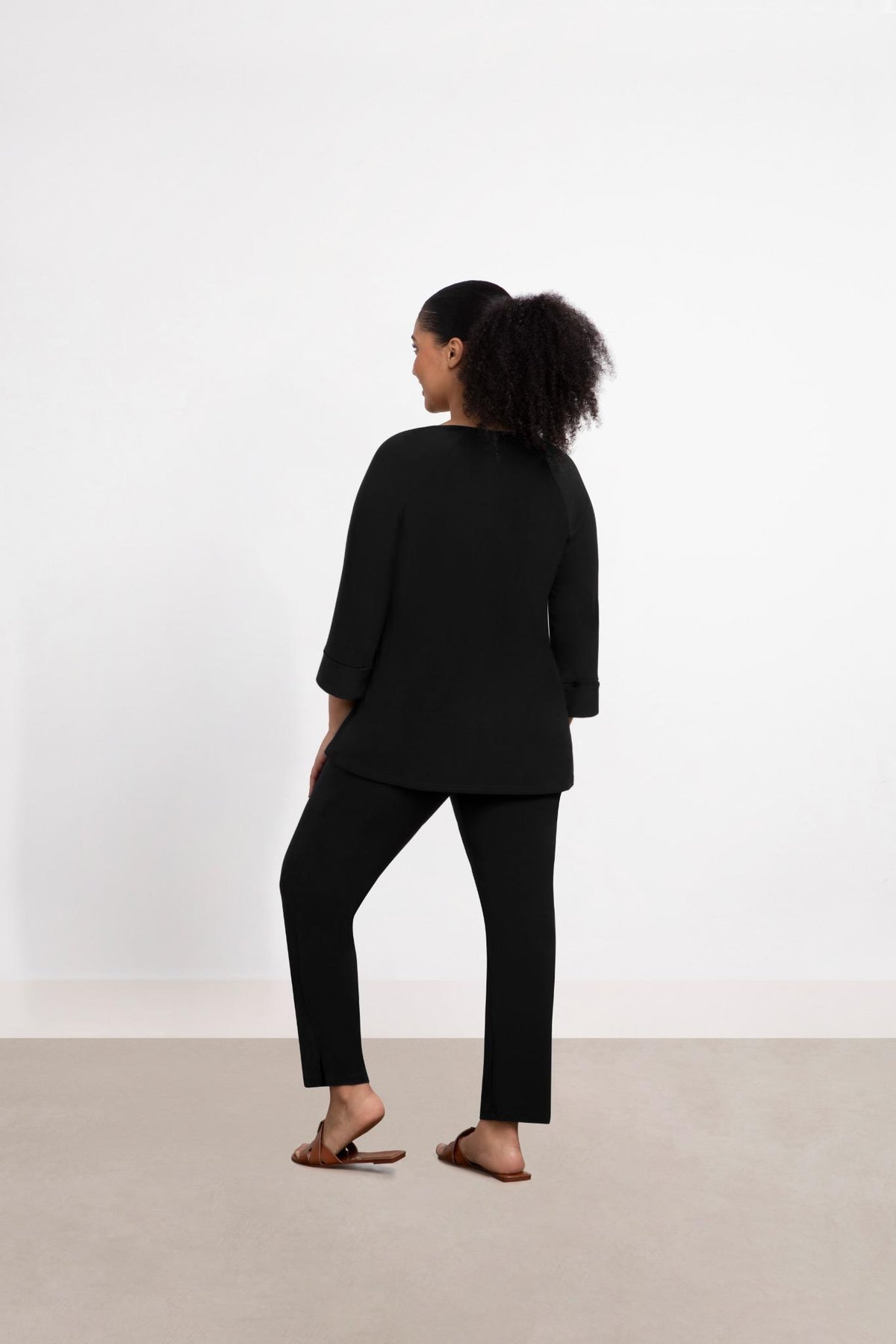 Classic and casual, you will want to wear our Angle Seam Raglan Top all day long. It features a scoop neckline with a navy trim, 3/4 sleeves with an opposite stripe border, a relaxed fit, and an angled hem that hits at the hip. Looks fabulous with any Sympli pants or leggings!