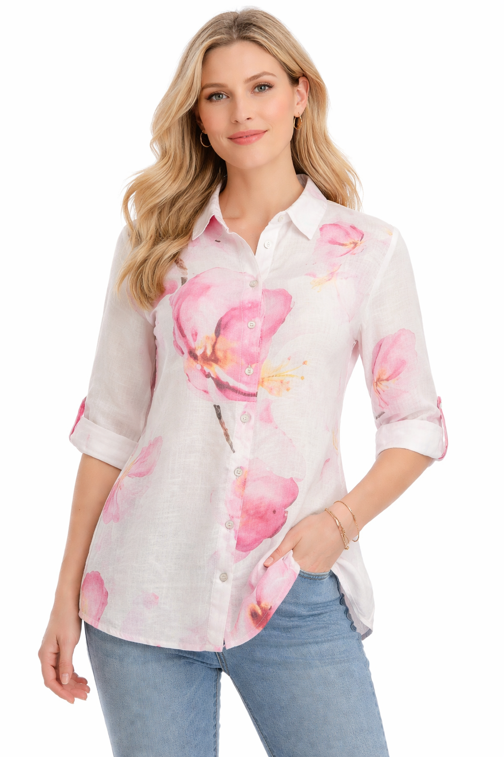 Softly feminine and effortlessly polished, this floral button-up blouse features a delicate watercolor-inspired print in romantic blush tones. Designed with a classic collar, front button closure, and roll-tab sleeves for versatile styling, it offers a relaxed yet refined silhouette. Lightweight and breathable, this blouse pairs beautifully with denim or tailored trousers for an easy, elevated everyday look.