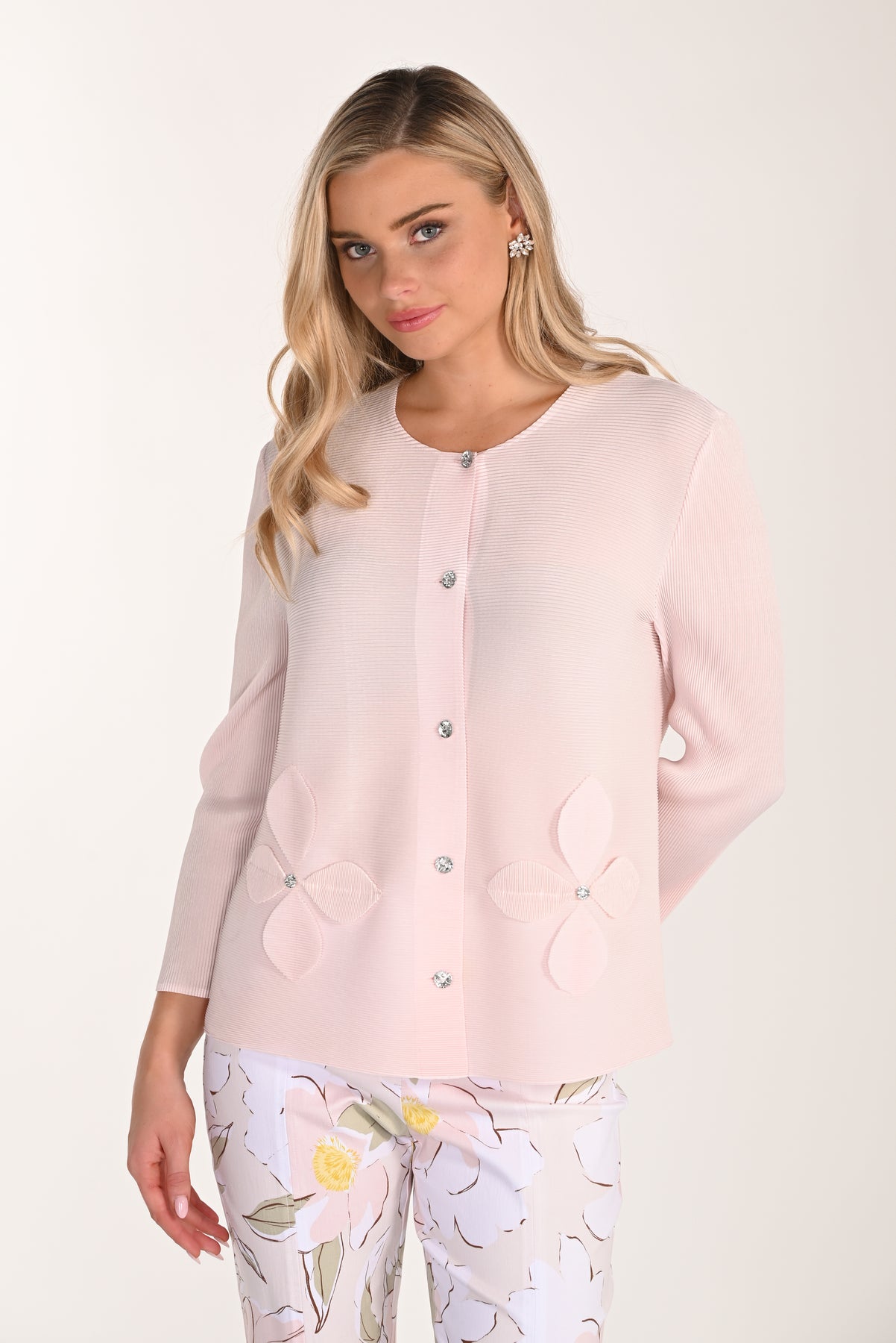 Elevate your everyday style with the Blush Petal Embellished Cardigan. This lightweight knit features delicate petal appliqués and sparkling crystal buttons that add instant sophistication to any outfit. Layer it over a shell or dress for effortless elegance that works from day to night. The soft, textured fabric and refined details make this cardigan a versatile wardrobe essential you'll reach for again and again.