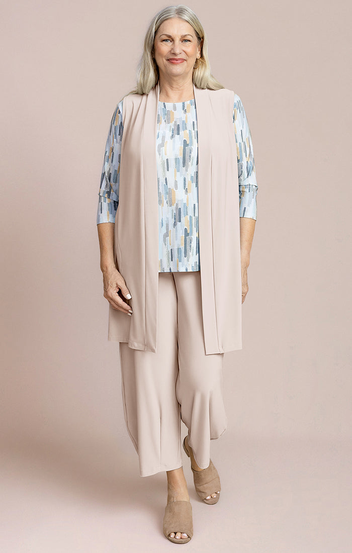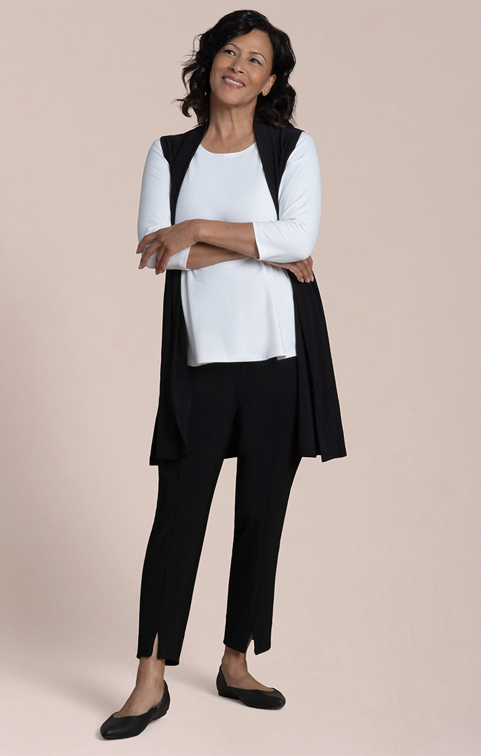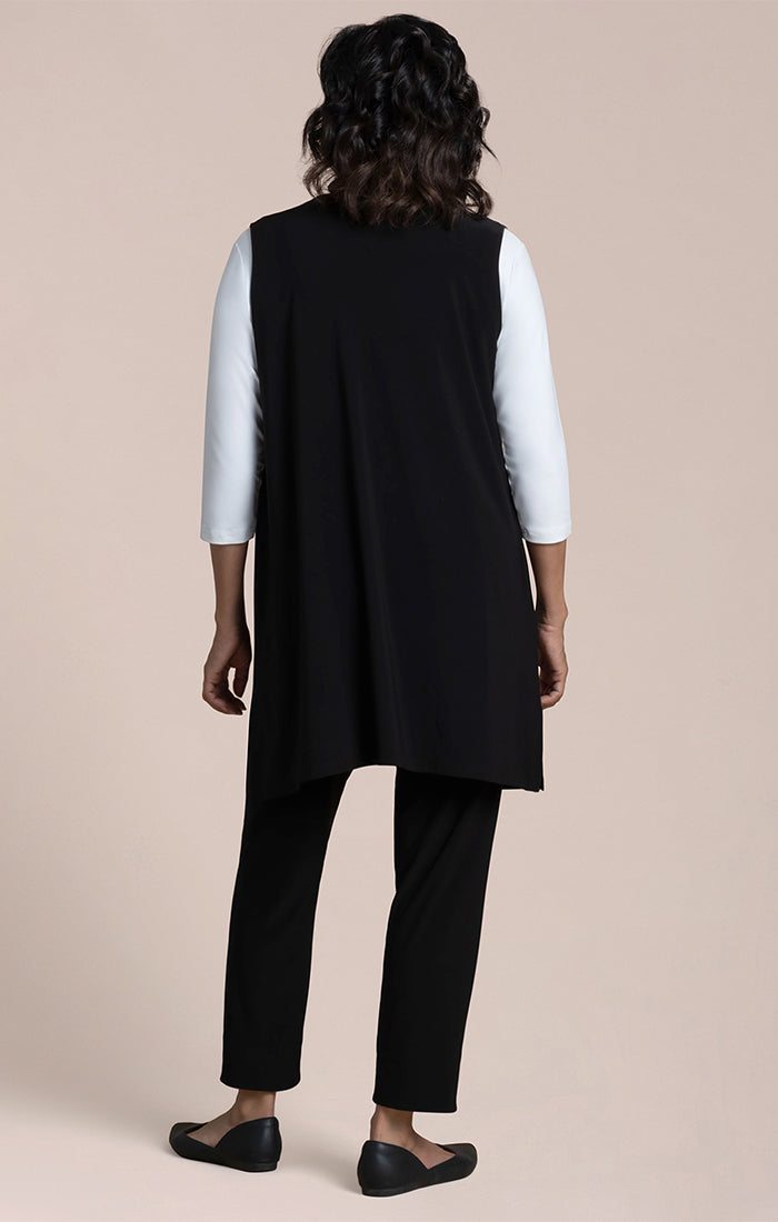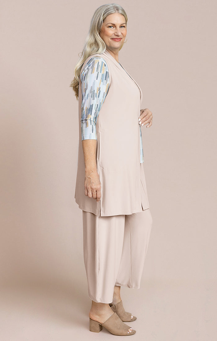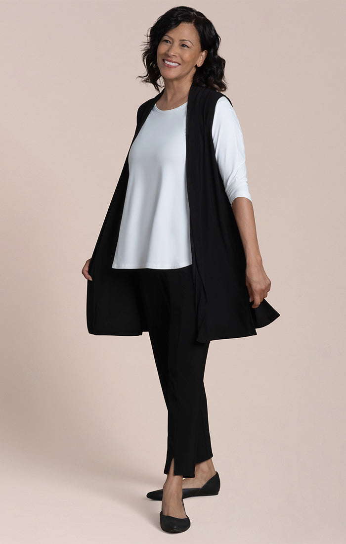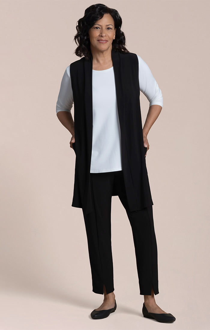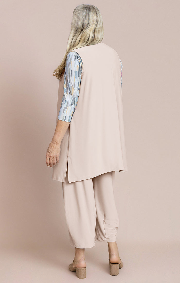 Experience effortless style and comfort with the Carefree Vest. Designed for everyday wear, this lightweight, knee-length cover features convenient side slits for ease of movement. Perfect for layering, it combines practicality with a breezy, relaxed fit you'll love all day long.