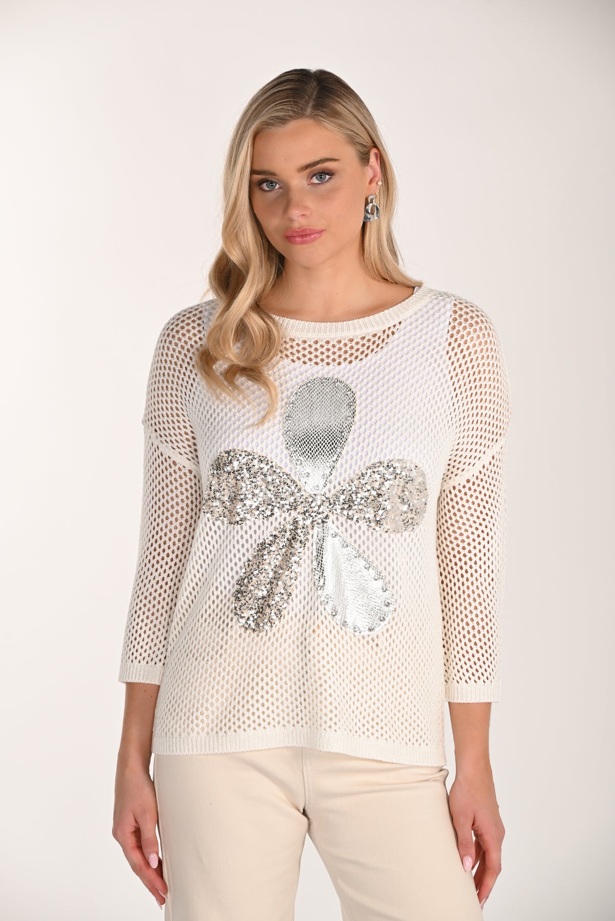 Sequin Bloom Mesh Knit Top features an open-mesh design with a shimmering floral sequin detail that catches the light beautifully. The relaxed fit and boat neckline flatter any frame, while 3/4 sleeves provide comfortable coverage. Layer it over a camisole or wear solo—this versatile piece effortlessly transitions from day to night.