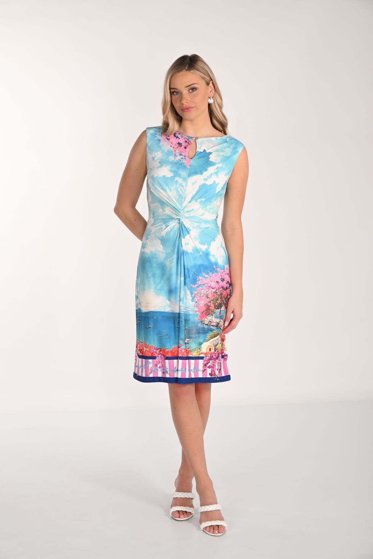 Sleek and striking, this coastal-inspired dress commands attention with its bold landscape print of azure skies and blooming florals. The boat neckline and keyhole cutout deliver understated edge, while the twisted waist cinches your figure with effortless grace. Knee-length and fearlessly feminine, it's your go-to for making waves at weddings, events, or anywhere you want to stand out.
