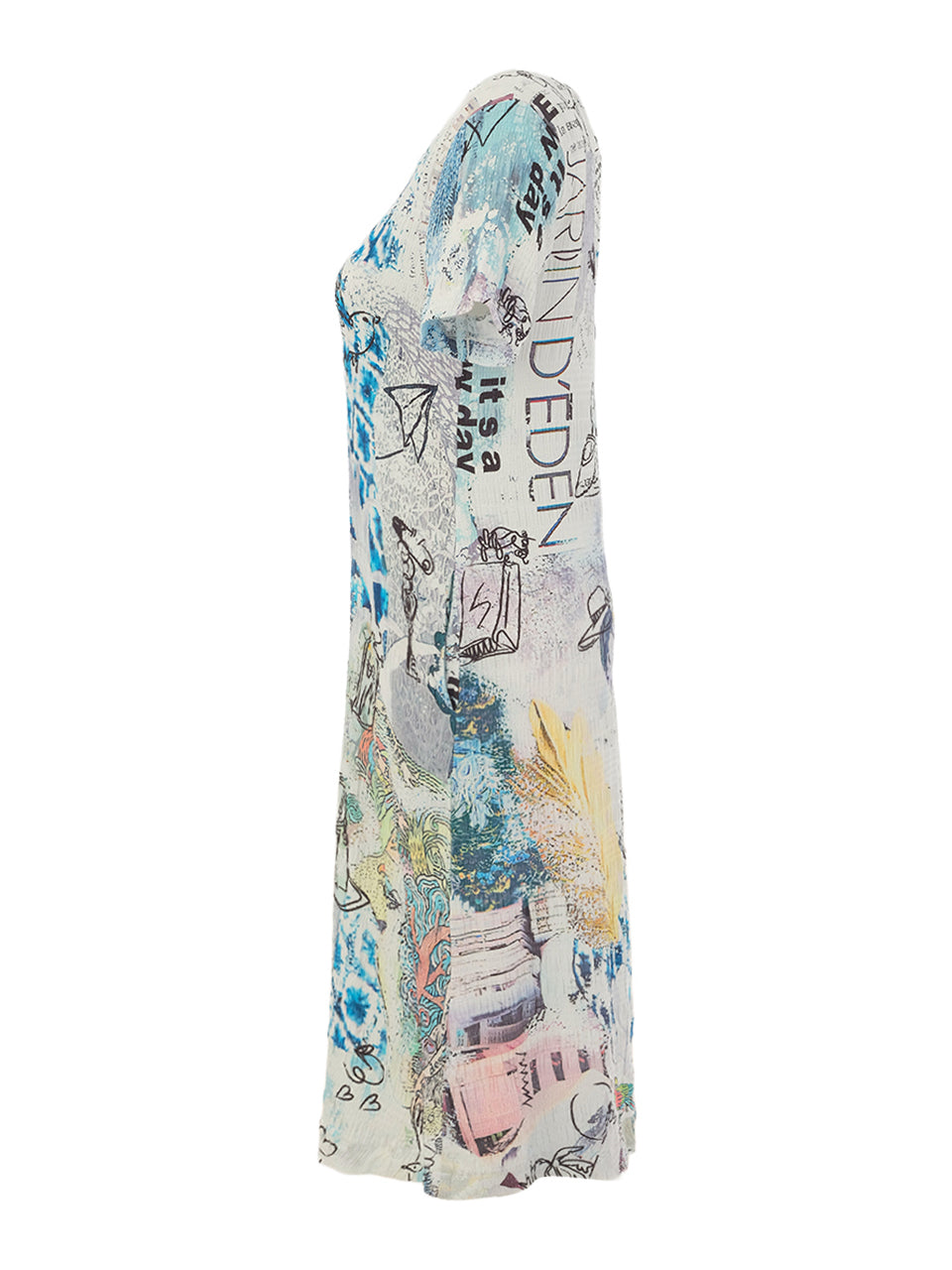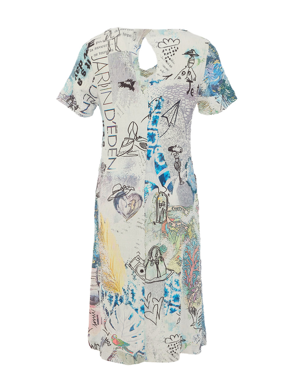 Short-sleeve shift dress with a relaxed, easy silhouette. Designed with a rounded neckline and subtle back keyhole detail. Features the Collage 46 artwork print, blending abstract textures, sketches, and layered motifs. Falls above the knee for a clean, modern look.