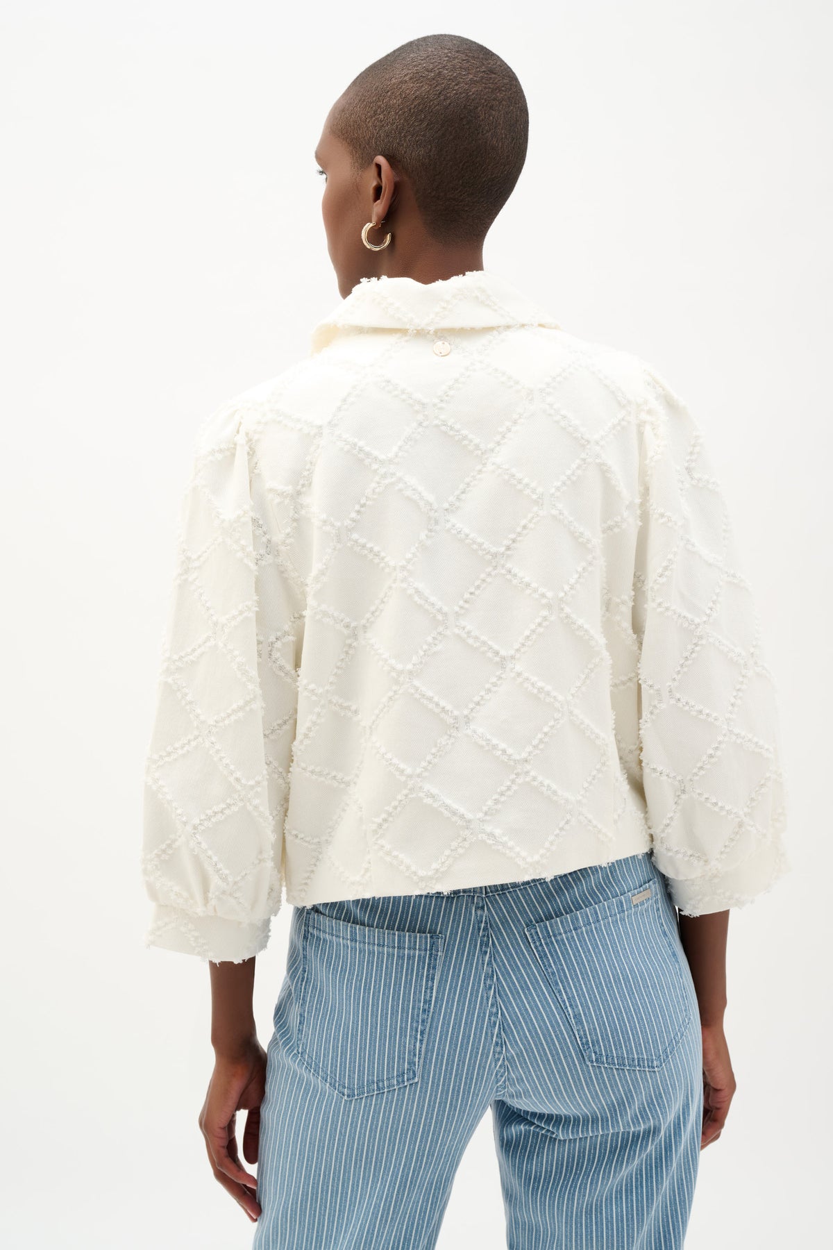 Made from cotton twill, this jacket pairs a structured feel with soft feminine touches. It features a crew neckline, three-quarter balloon sleeves with cuffs, and discreet side-seam pockets, while the diamond pattern adds understated texture and visual interest.