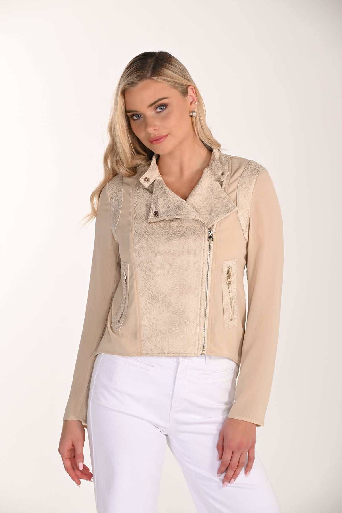 Blue floral print meets modern moto style in this lightweight jacket. Featuring an asymmetrical zip, silver hardware, and a cropped silhouette, it delivers instant polish to any look. Perfect for layering over dresses or denim, this versatile piece balances feminine charm with edgy sophistication—your go-to jacket for spring through fall.