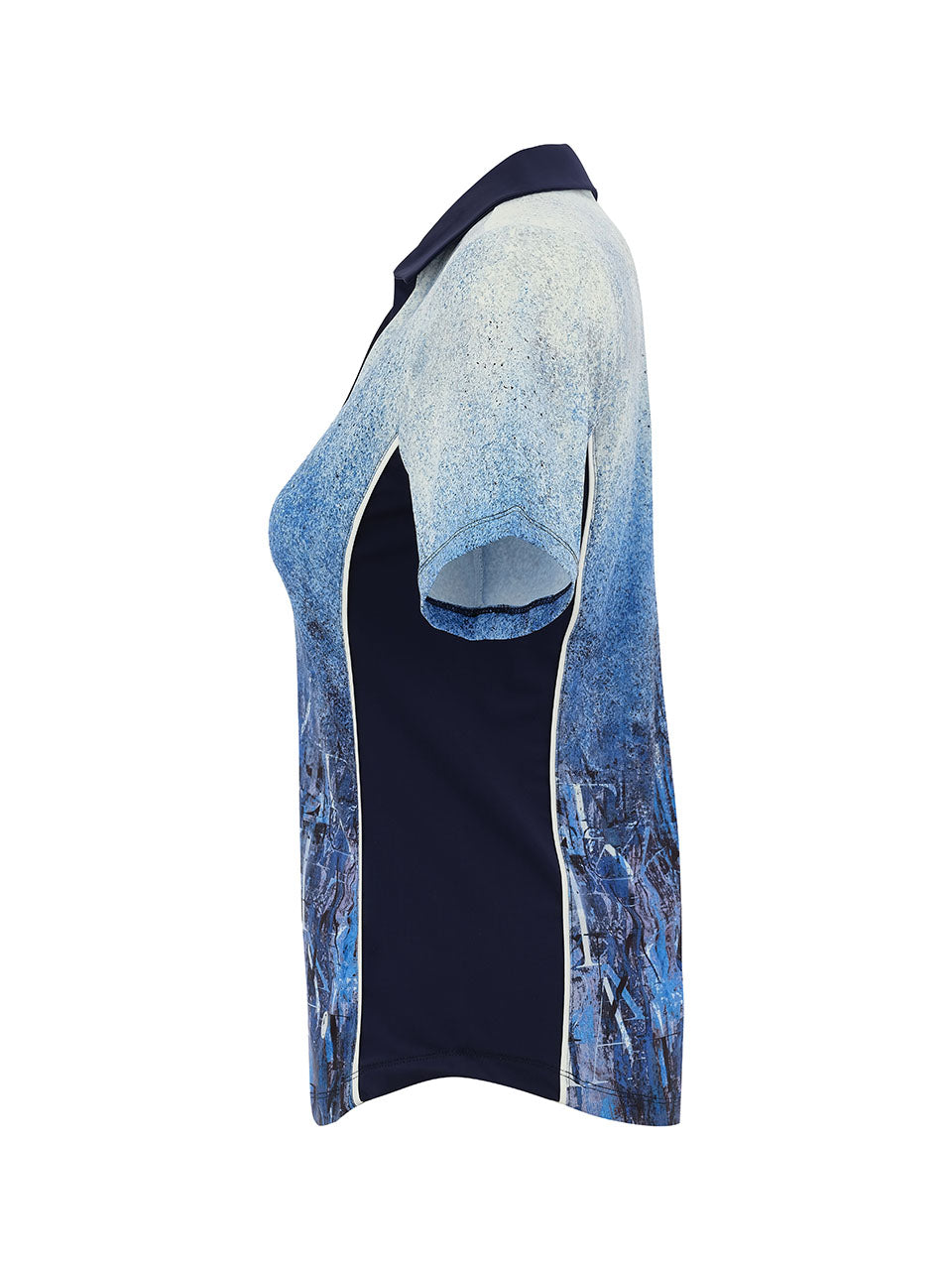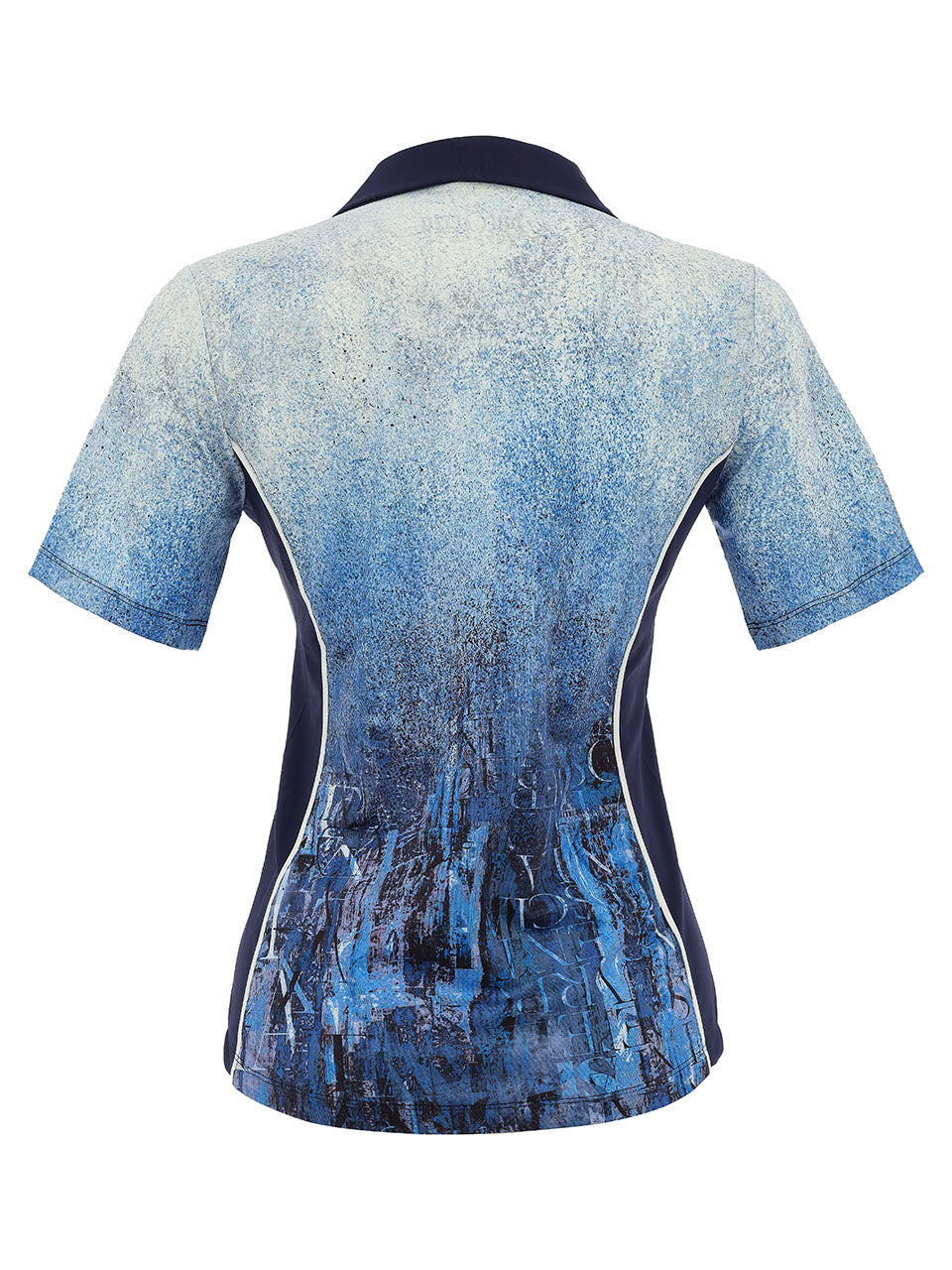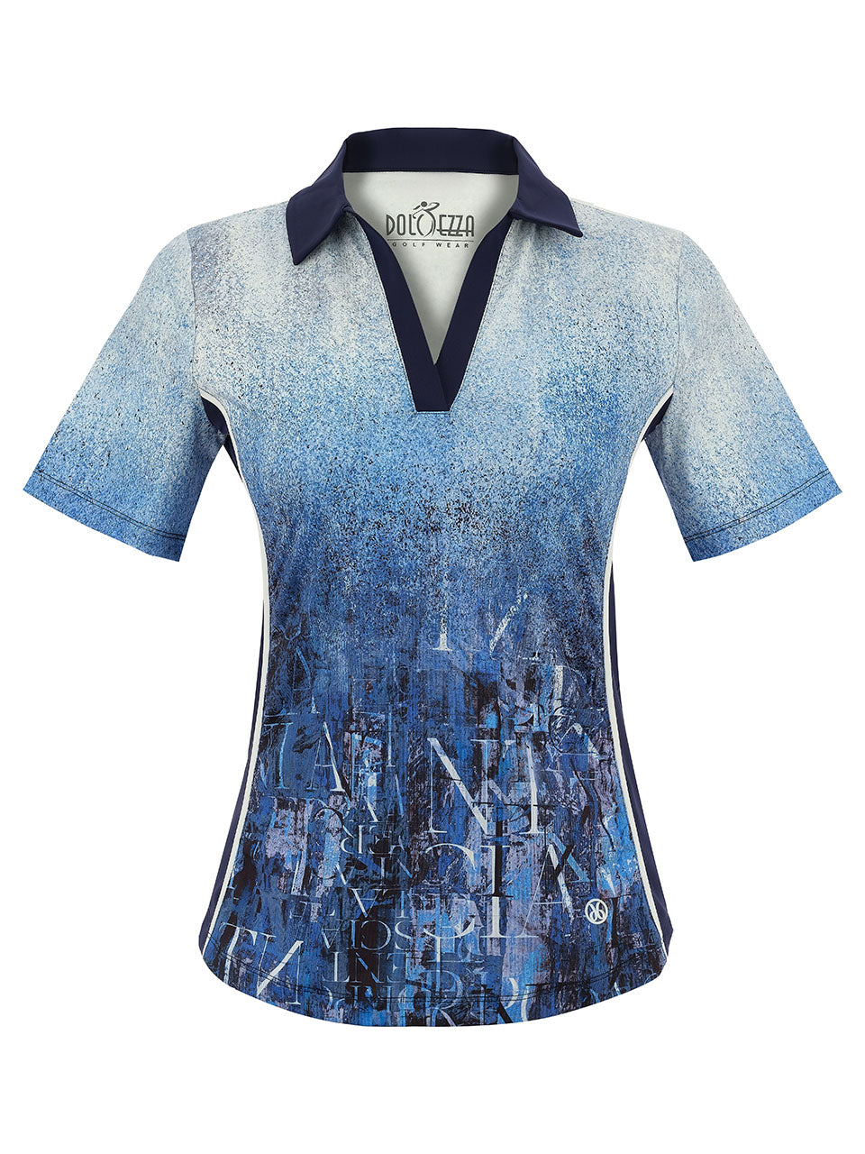 Elevate your active wardrobe with this modern performance polo, designed for both style and comfort on and off the course. It features an artistic gradient print in layered shades of blue with subtle script-inspired detailing, creating a contemporary and sophisticated look. A contrast navy collar and V-neck placket add a polished finish, while the lightweight stretch fabric allows for breathable comfort and easy movement throughout the day.