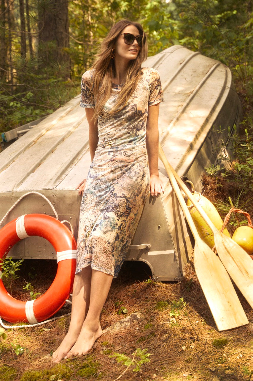 Elegant mesh midi dress featuring a marbled print and soft stretch fabric that flatters your figure. Sheer short sleeves and layered overlay create delicate detail, while subtle ruching at the waist enhances your silhouette. This sophisticated piece flows to mid-calf, making it ideal for special occasions and upscale events. Style with heels for a polished, refined appearance.
