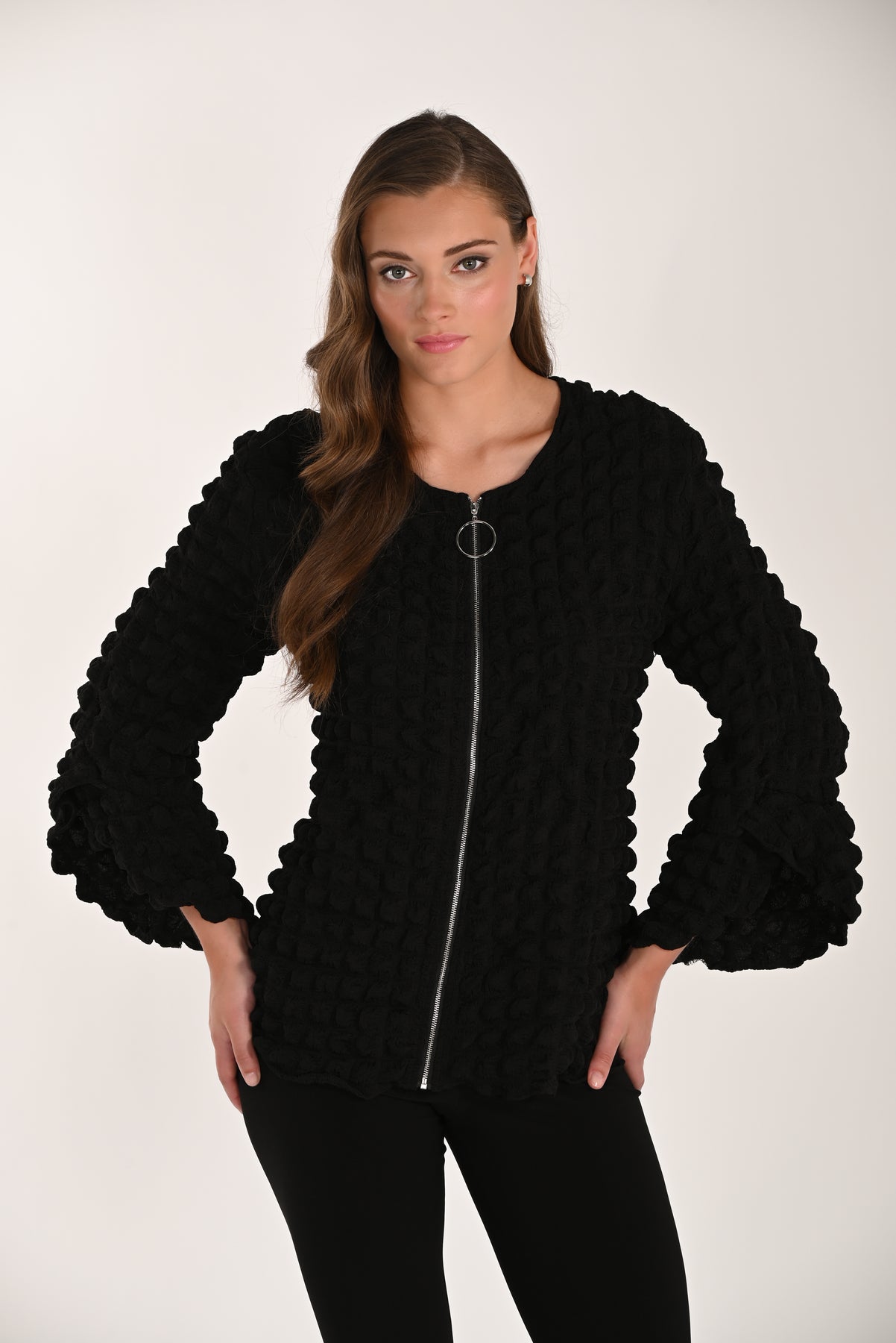 Elevate your wardrobe with the Noir Texture Zip Jacket—a sophisticated piece that combines contemporary design with timeless elegance. Crafted from subtly textured fabric, this jacket delivers visual interest while maintaining a polished aesthetic. The distinctive ring-pull zipper adds an edgy modern detail, while flowing bell sleeves introduce graceful movement and dimension. Its gently flared silhouette flatters your frame and pairs beautifully with Dream Pants or classic denim alike. Whether you're dressing up for evening or layering for everyday wear, this versatile black jacket becomes an essential foundation for countless outfits that exude refined confidence.