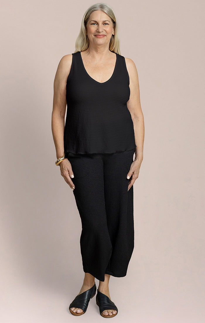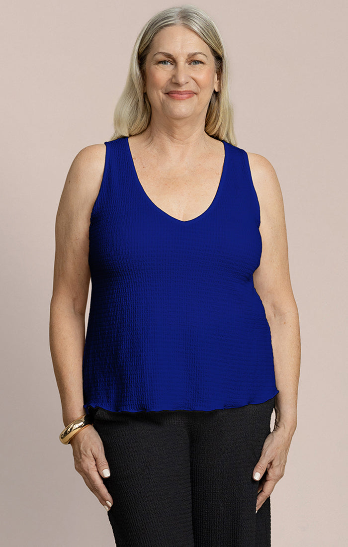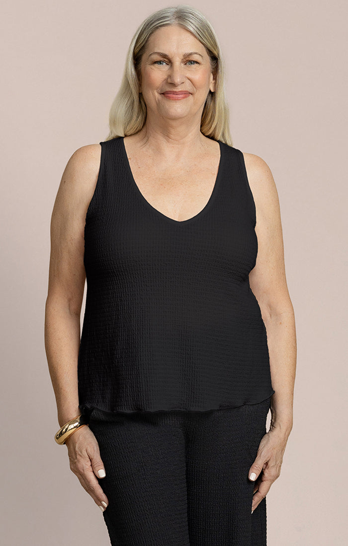 A versatile V-neck tank that works as a standalone piece or layered under your favorite jackets and cardigans. The soft, textured fabric drapes beautifully while the relaxed fit keeps you comfortable all day. Flattering neckline and wider straps offer excellent coverage and support.