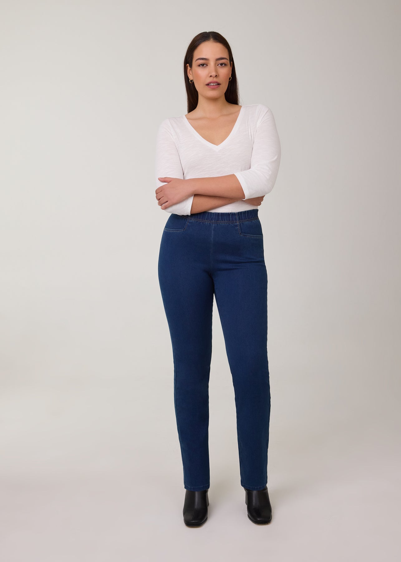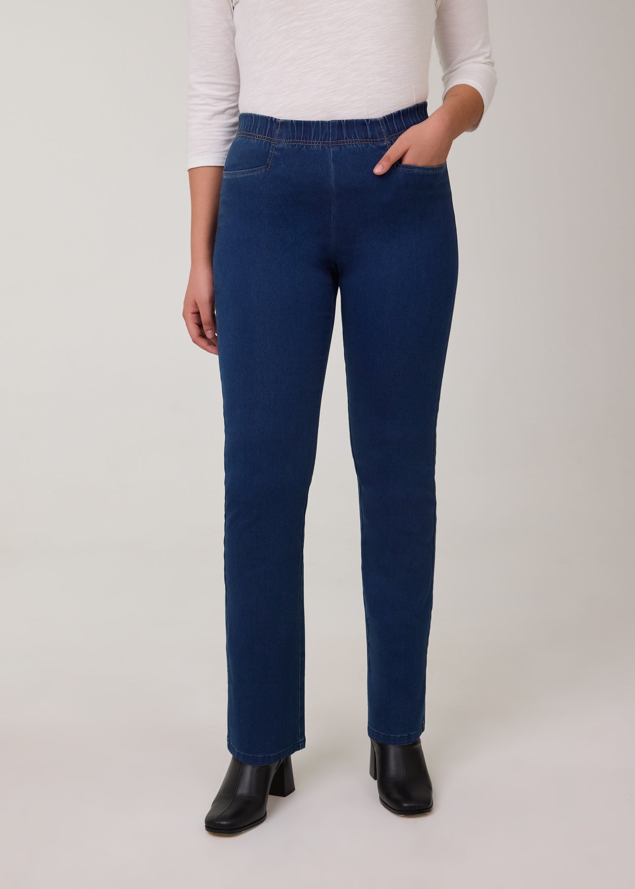 Effortlessly flattering with a touch of classic flare, the D-Lux Pull-On Bootcut Denim is designed for all-day comfort and easy style. The pull-on design creates a smooth, streamlined silhouette, while the elastic waistband offers a flexible, comfortable fit without restriction. The subtle bootcut leg elongates the figure and pairs perfectly with boots or heels for a polished finish.