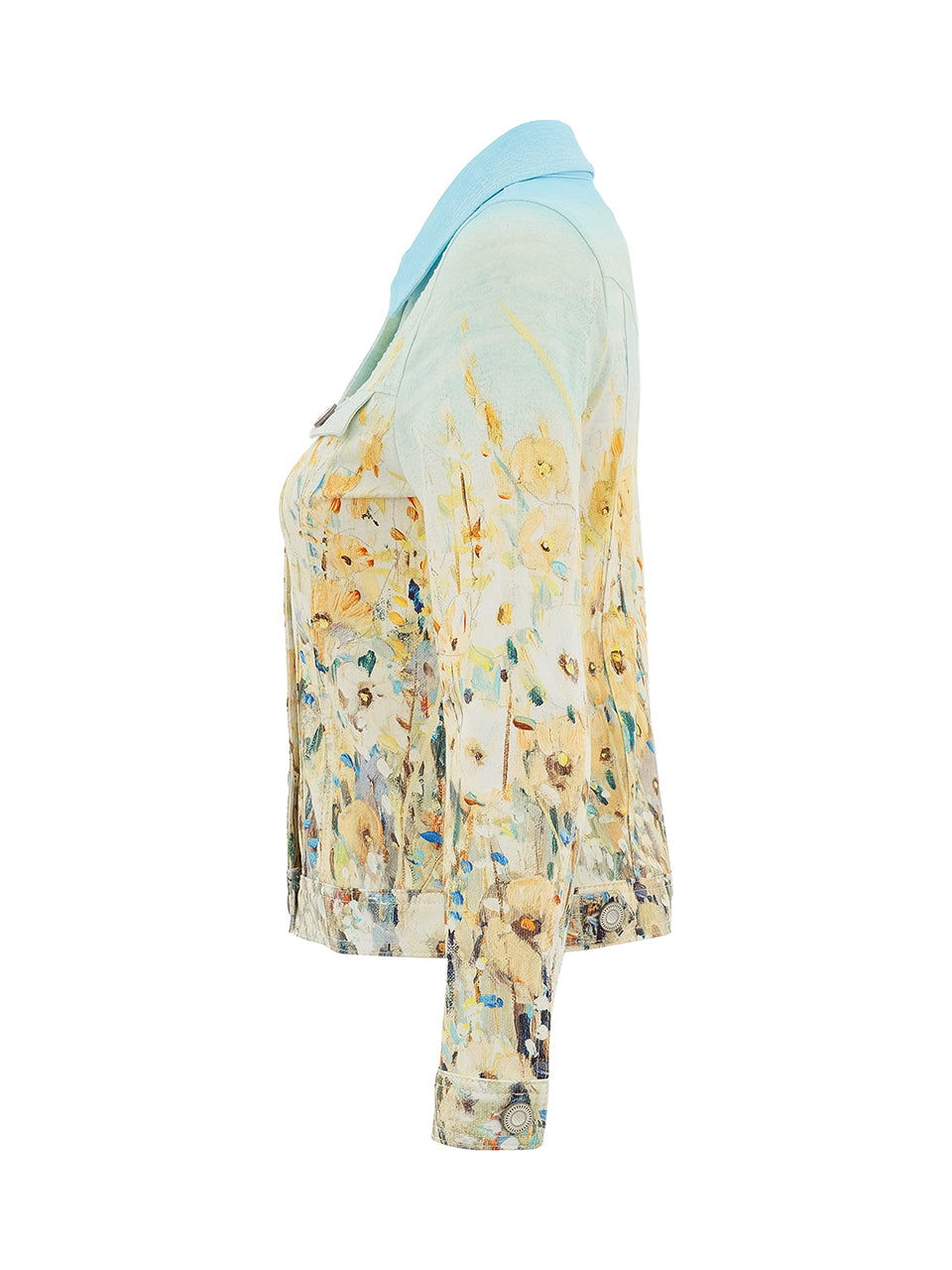 Artfully crafted and effortlessly refined, this tailored jacket features a soft ombré seafoam backdrop adorned with delicate golden wildflowers in a painterly print. Designed with a classic collar, button-front closure, and structured seams, it offers a flattering silhouette that shapes beautifully at the waist. The lightweight fabric makes it perfect for layering over dresses or pairing with crisp white denim. Elegant yet expressive, this piece captures the essence of coastal artistry with modern sophistication.