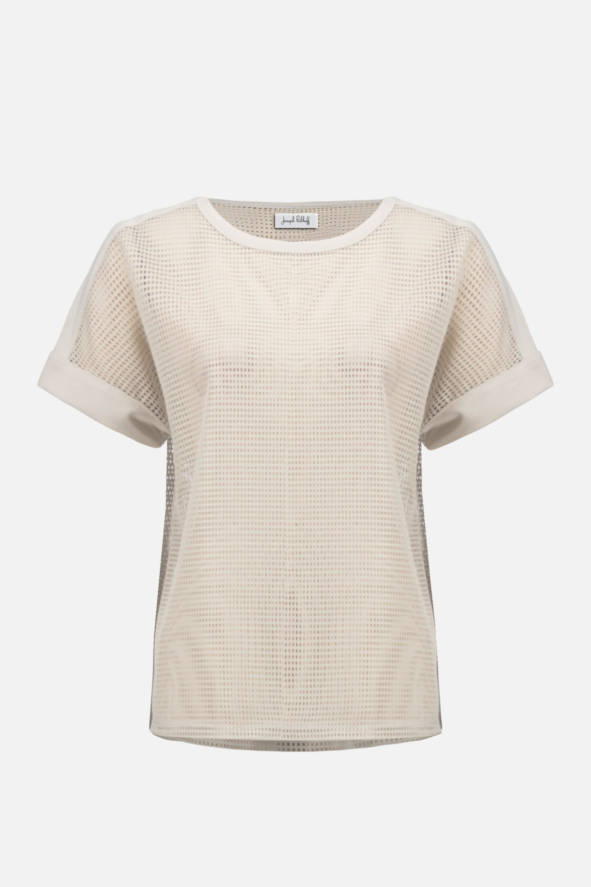 A subtle mix of texture brings fresh dimension to this laid-back essential. Designed with a wide-banded crewneck, this straight top features mesh shoulders, short dolman sleeves, and easy side slits.
