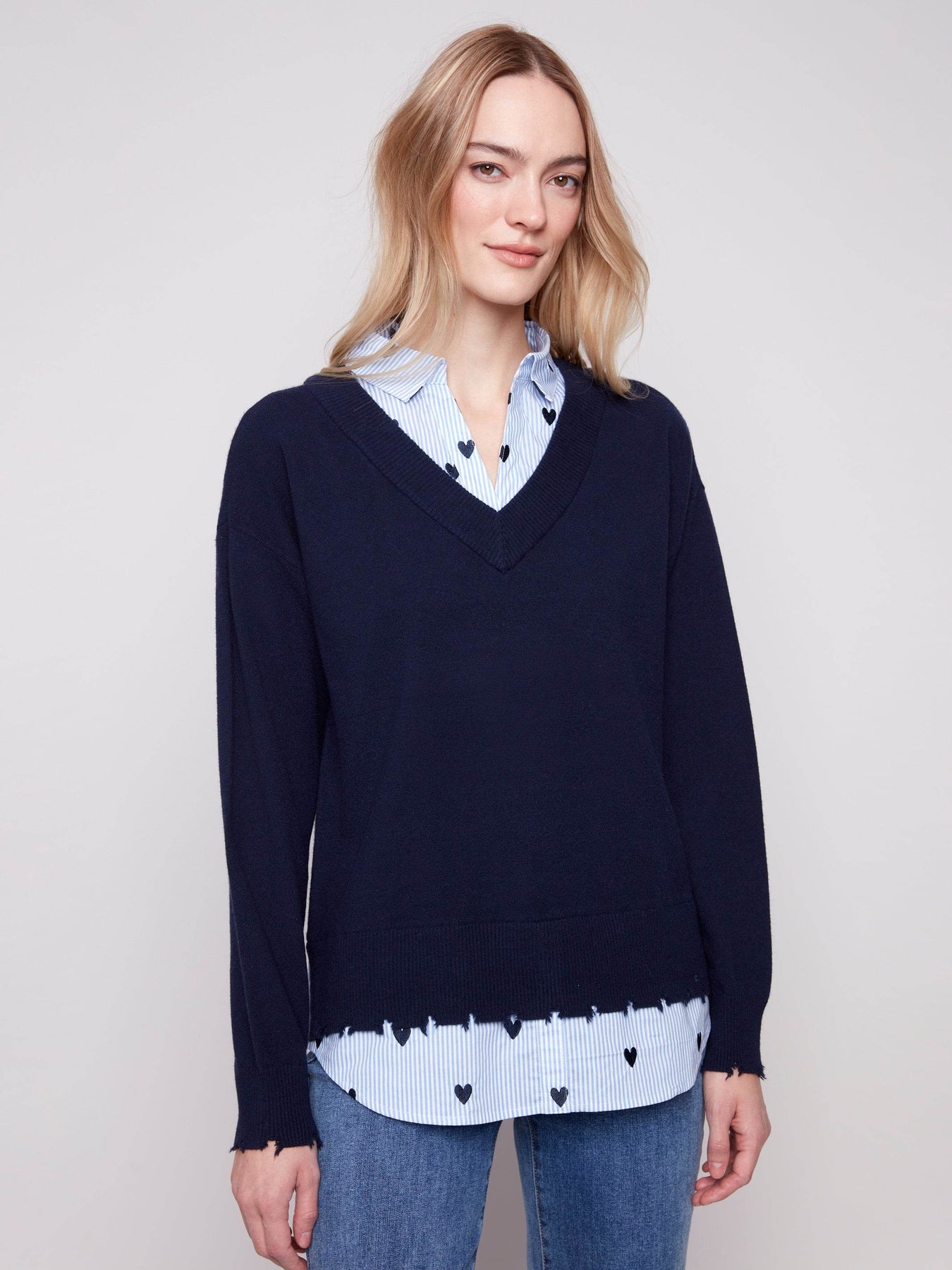V-Neck Fooler Sweater With Embroidered Shirt Collar