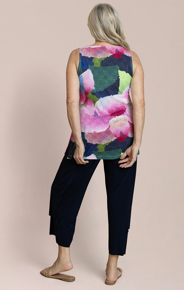 Sleeveless Nu Ideal Print delivers eye-catching style in a wearable package. Featuring an abstract floral design in vibrant jewel tones, this lightweight tank keeps you cool while looking polished. The relaxed fit works beautifully solo or layered, making it your go-to piece for effortless versatility.